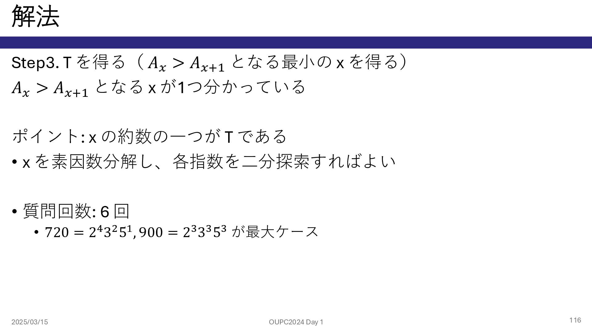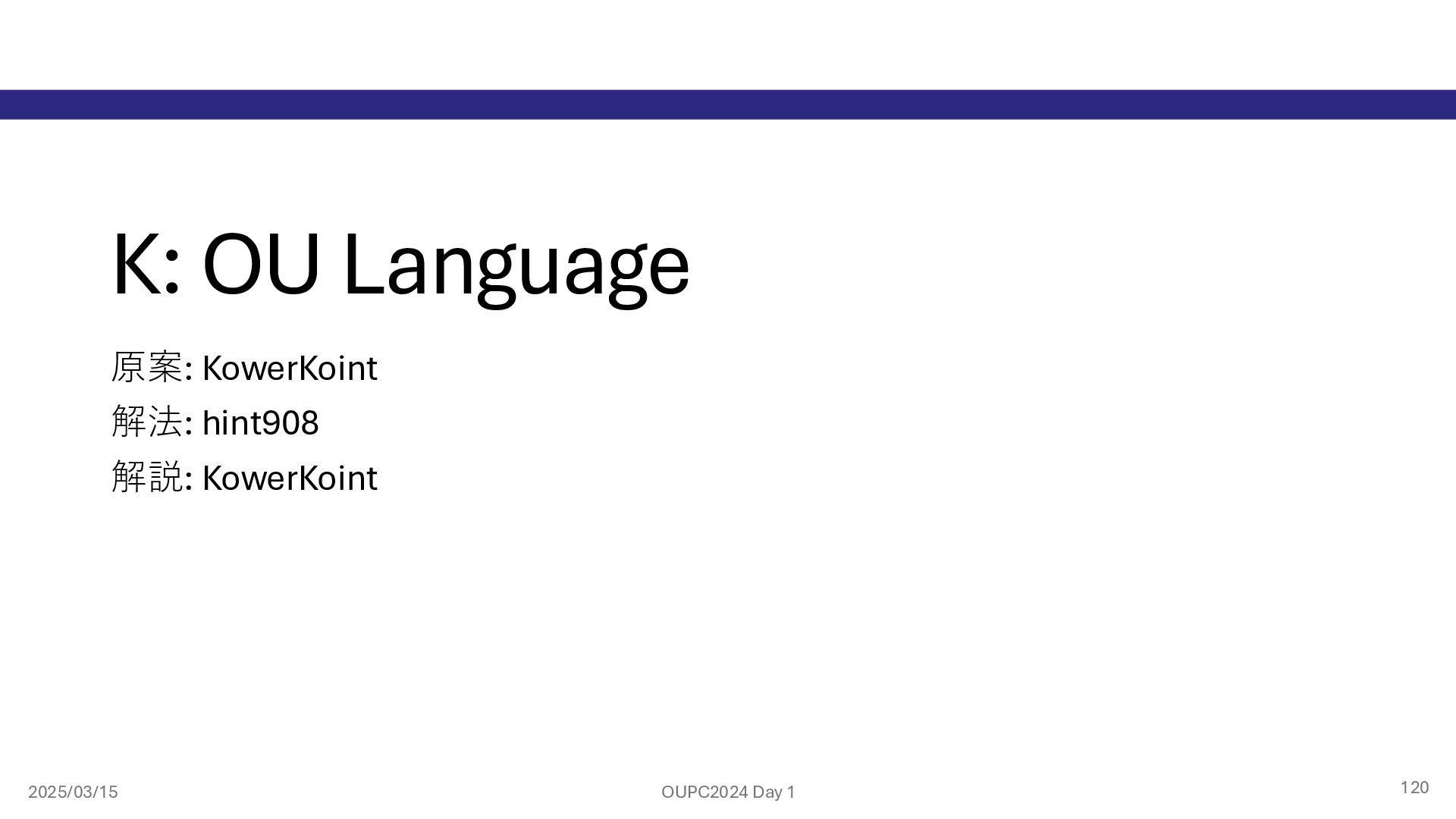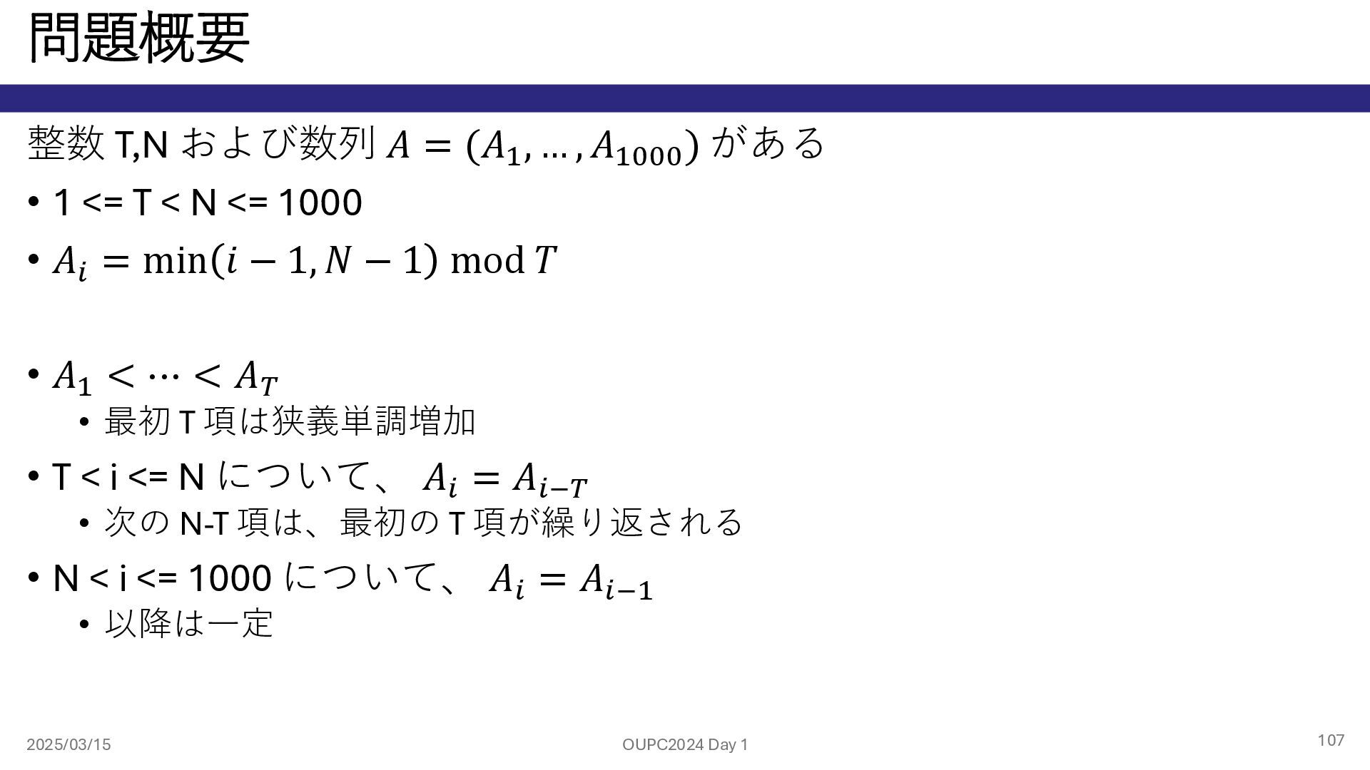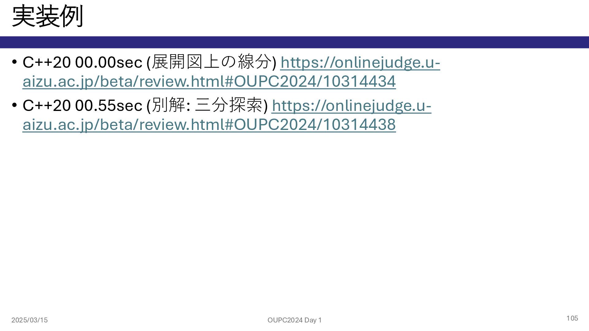 , 𝑔 𝑆2 , 𝑔 𝑆3 , 𝑔 𝑓 𝑆1 , 𝑆2 , 𝑔 𝑓 𝑆1 , 𝑆3 , 𝑔 𝑓 𝑆2 , 𝑆3 , 𝑔 𝑓 𝑓 𝑆1 , 𝑆2 , 𝑆3 の7つが分かればよくてこれは再帰で求まる • 𝑂(7𝐾) (最初𝐾 ≤ 9にしてて遅い言語にだけメモ化を要求しそうだったので8になった) 2025/03/15 OUPC2024 Day 1 56 𝑔 𝑆 = 全体 − 𝑆1 = 𝑆2 ≠ 𝑆3 のとき − 𝑆1 = 𝑆3 ≠ 𝑆2 − 𝑆2 = 𝑆3 ≠ 𝑆1 − 𝑆1 = 𝑆2 = 𝑆3 = 𝑔 𝑆1 𝑔 𝑆2 𝑔 𝑆3 − 𝑔 𝑓 𝑆1 , 𝑆2 𝑔 𝑆3 − 𝑔 𝑓 𝑓 𝑆1 , 𝑆2 , 𝑆3 − ቀ ቁ 𝑔 𝑓 𝑆1 , 𝑆3 𝑔 𝑆2 − 𝑔 𝑓 𝑓 𝑆1 , 𝑆2 , 𝑆3 − 𝑔 𝑓 𝑆2 , 𝑆3 𝑔 𝑆1 − 𝑔 𝑓 𝑓 𝑆1 , 𝑆2 , 𝑆3 − 𝑔 𝑓 𝑓 𝑆1 , 𝑆2 , 𝑆3 = 𝑔 𝑆1 𝑔 𝑆2 𝑔 𝑆3 − 𝑔 𝑓 𝑆1 , 𝑆2 𝑔 𝑆3 − 𝑔 𝑓 𝑆1 , 𝑆3 𝑔 𝑆2 − 𝑔 𝑓 𝑆2 , 𝑆3 𝑔 𝑆1 + 2𝑔 𝑓 𝑓 𝑆1 , 𝑆2 , 𝑆3