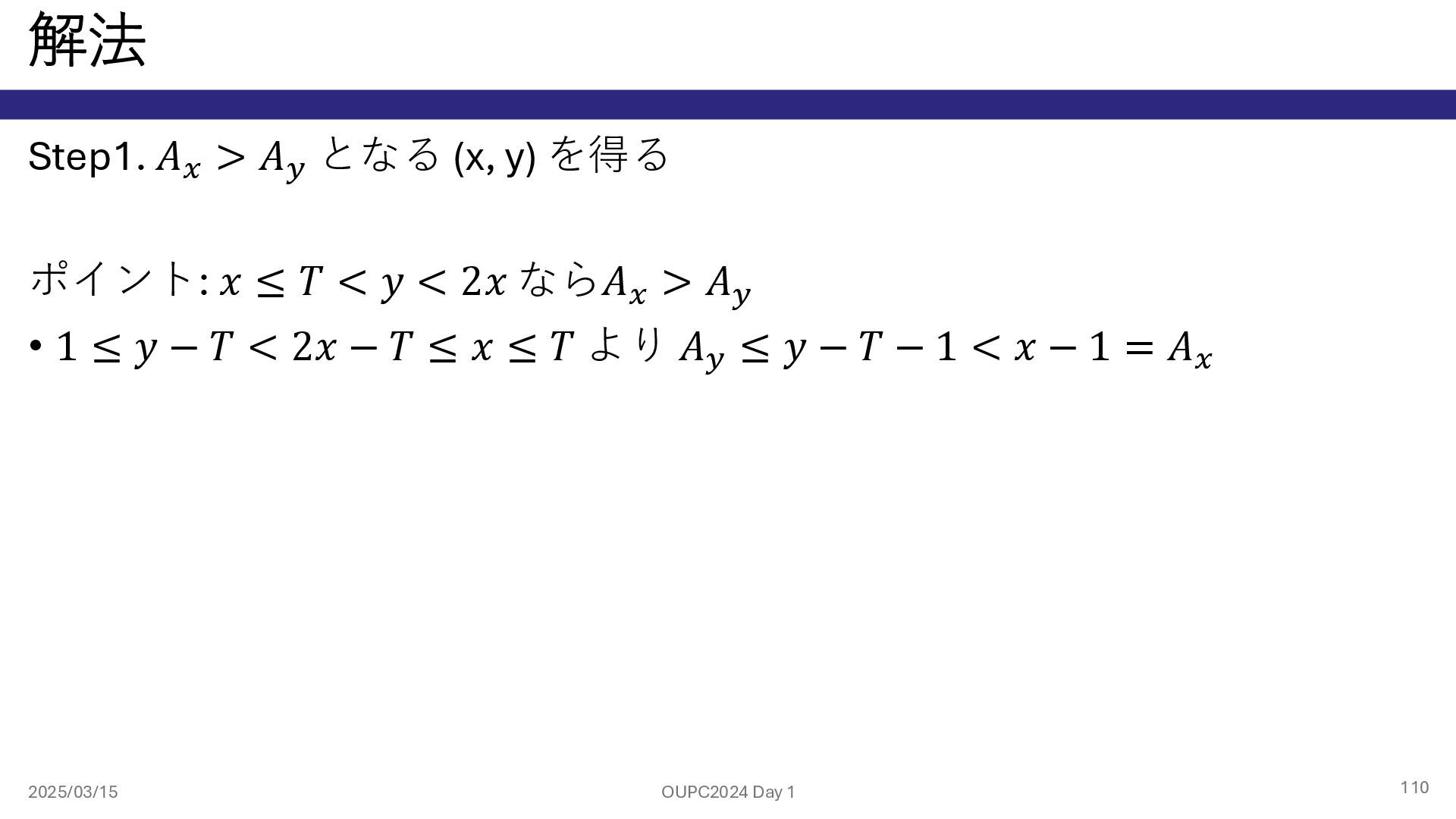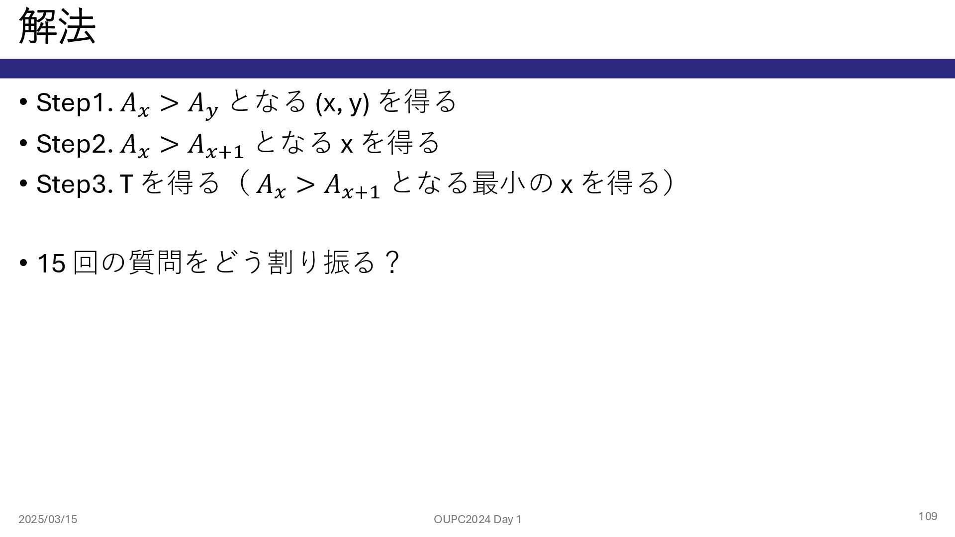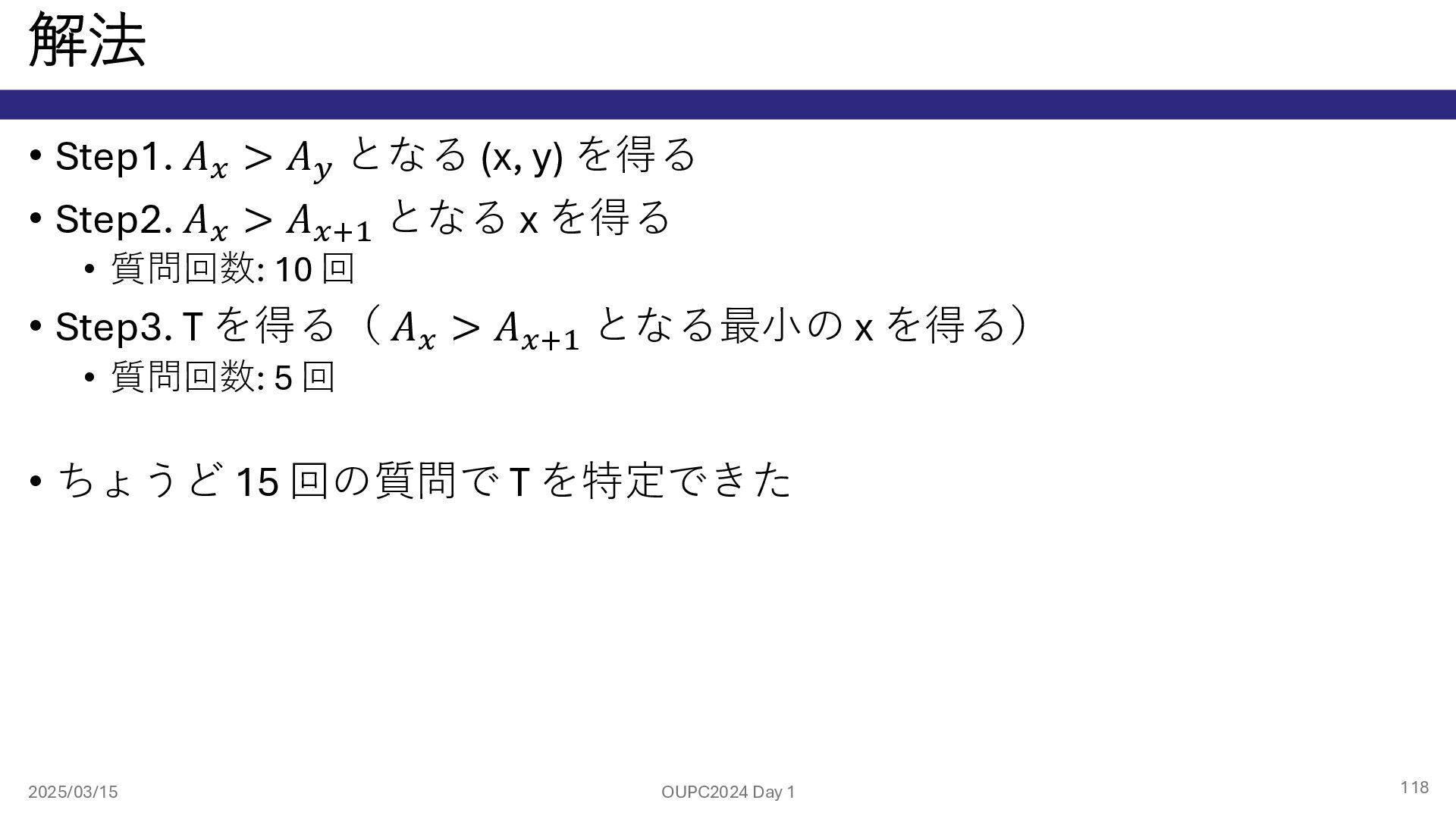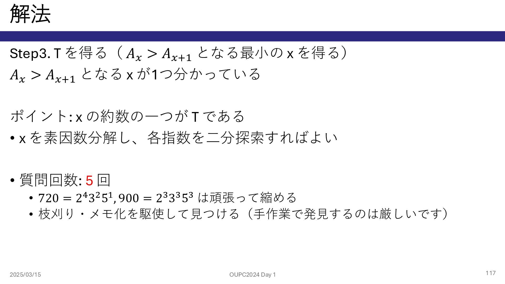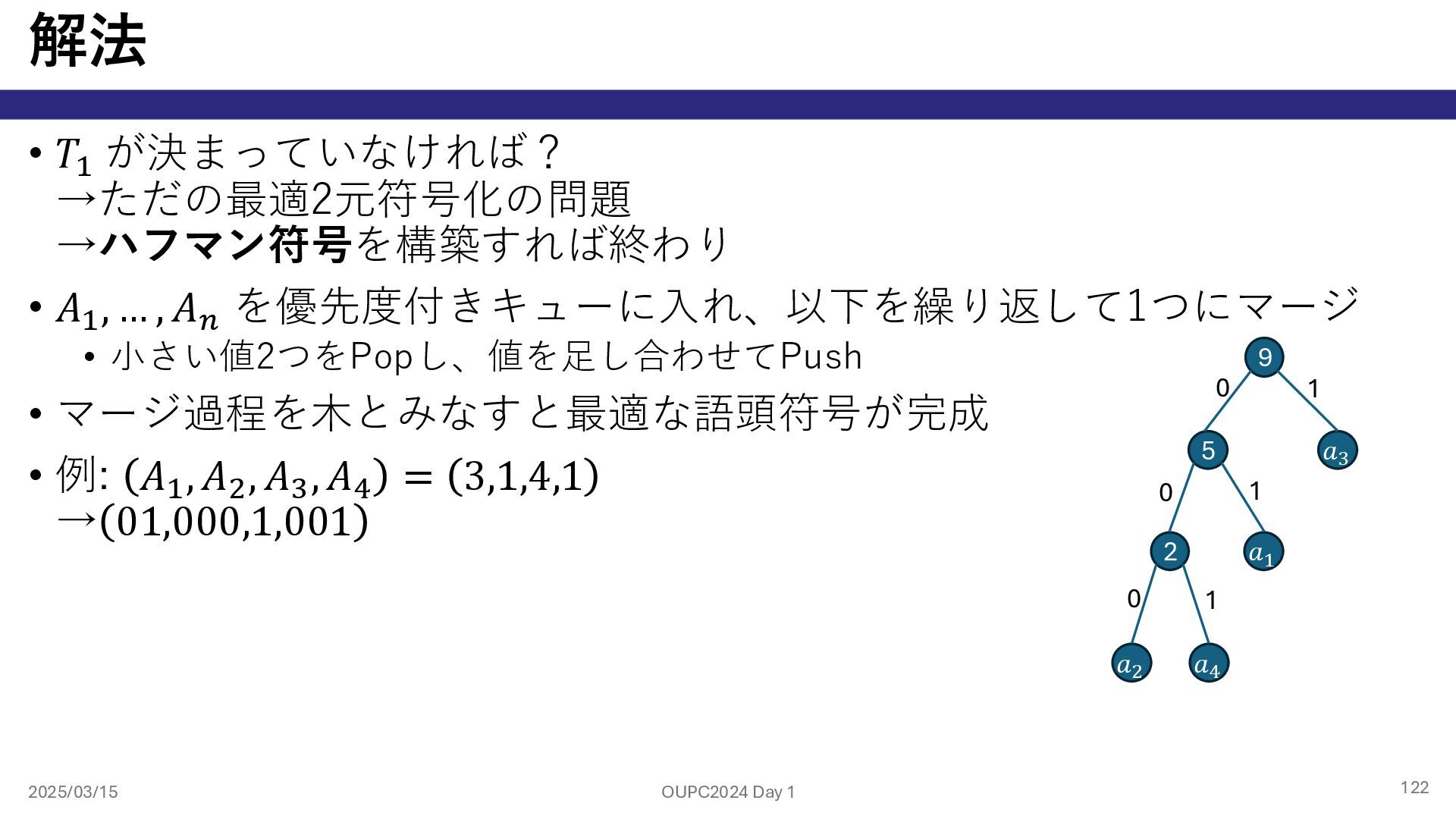 , 𝑔 𝑆2 , 𝑔 𝑆3 , 𝑔 𝑓 𝑆1 , 𝑆2 , 𝑔 𝑓 𝑆1 , 𝑆3 , 𝑔 𝑓 𝑆2 , 𝑆3 , 𝑔 𝑓 𝑓 𝑆1 , 𝑆2 , 𝑆3 の7つが分かればよくてこれは再帰で求まる • 𝑂(7𝐾) (最初𝐾 ≤ 9にしてて遅い言語にだけメモ化を要求しそうだったので8になった) 2025/03/15 OUPC2024 Day 1 56 𝑔 𝑆 = 全体 − 𝑆1 = 𝑆2 ≠ 𝑆3 のとき − 𝑆1 = 𝑆3 ≠ 𝑆2 − 𝑆2 = 𝑆3 ≠ 𝑆1 − 𝑆1 = 𝑆2 = 𝑆3 = 𝑔 𝑆1 𝑔 𝑆2 𝑔 𝑆3 − 𝑔 𝑓 𝑆1 , 𝑆2 𝑔 𝑆3 − 𝑔 𝑓 𝑓 𝑆1 , 𝑆2 , 𝑆3 − ቀ ቁ 𝑔 𝑓 𝑆1 , 𝑆3 𝑔 𝑆2 − 𝑔 𝑓 𝑓 𝑆1 , 𝑆2 , 𝑆3 − 𝑔 𝑓 𝑆2 , 𝑆3 𝑔 𝑆1 − 𝑔 𝑓 𝑓 𝑆1 , 𝑆2 , 𝑆3 − 𝑔 𝑓 𝑓 𝑆1 , 𝑆2 , 𝑆3 = 𝑔 𝑆1 𝑔 𝑆2 𝑔 𝑆3 − 𝑔 𝑓 𝑆1 , 𝑆2 𝑔 𝑆3 − 𝑔 𝑓 𝑆1 , 𝑆3 𝑔 𝑆2 − 𝑔 𝑓 𝑆2 , 𝑆3 𝑔 𝑆1 + 2𝑔 𝑓 𝑓 𝑆1 , 𝑆2 , 𝑆3