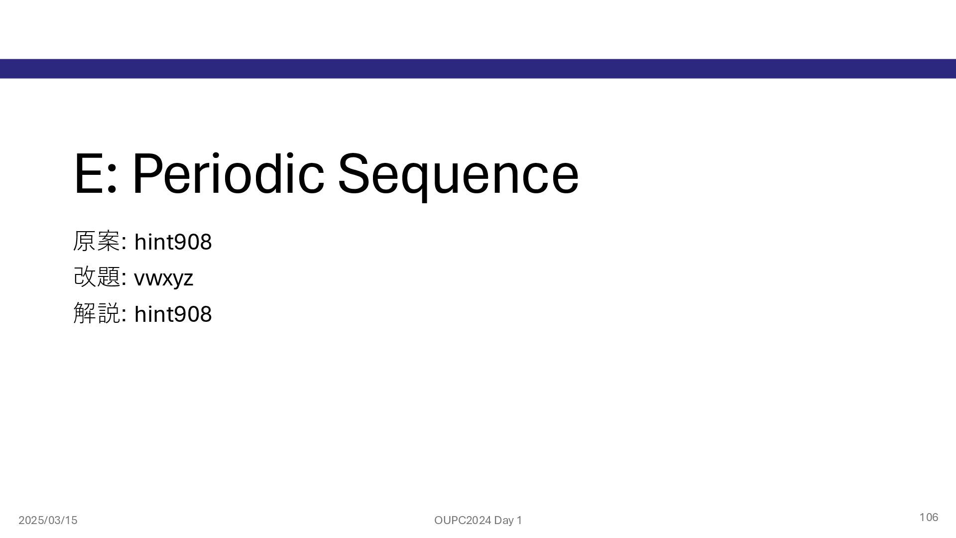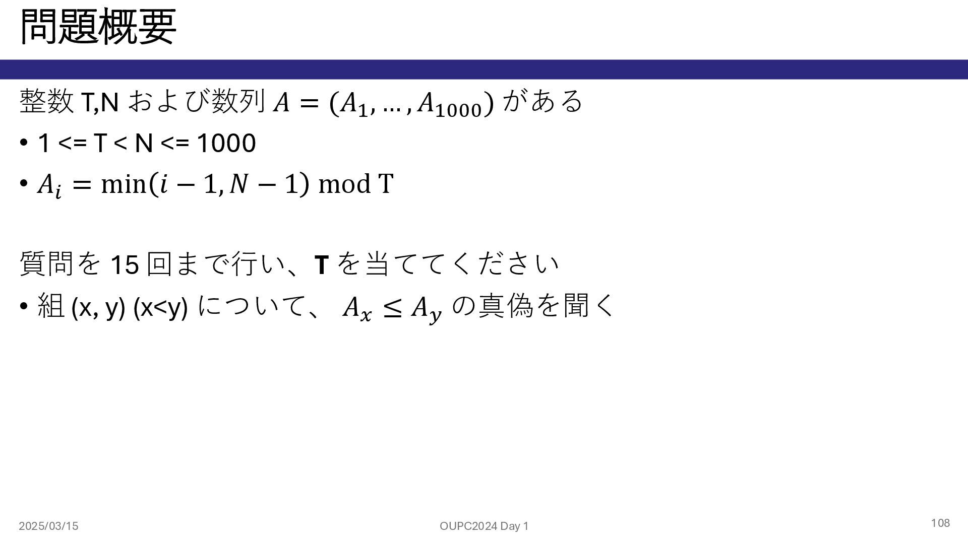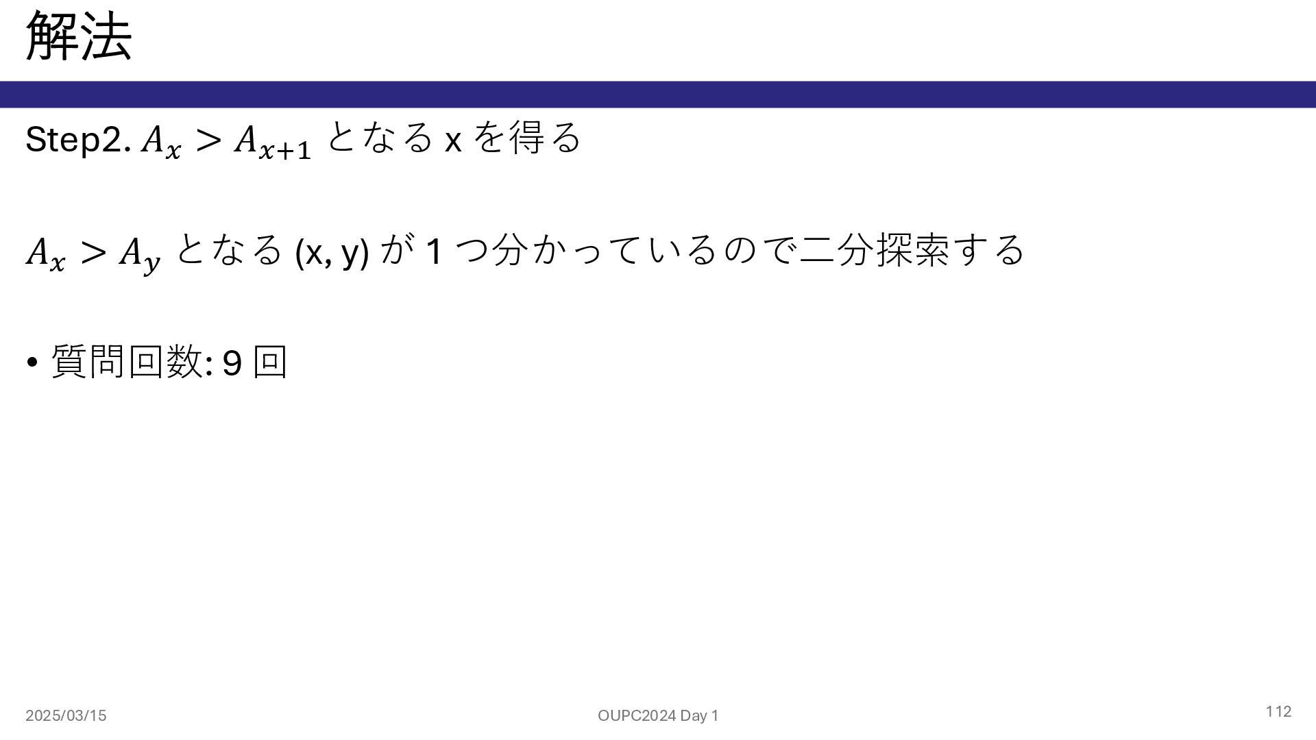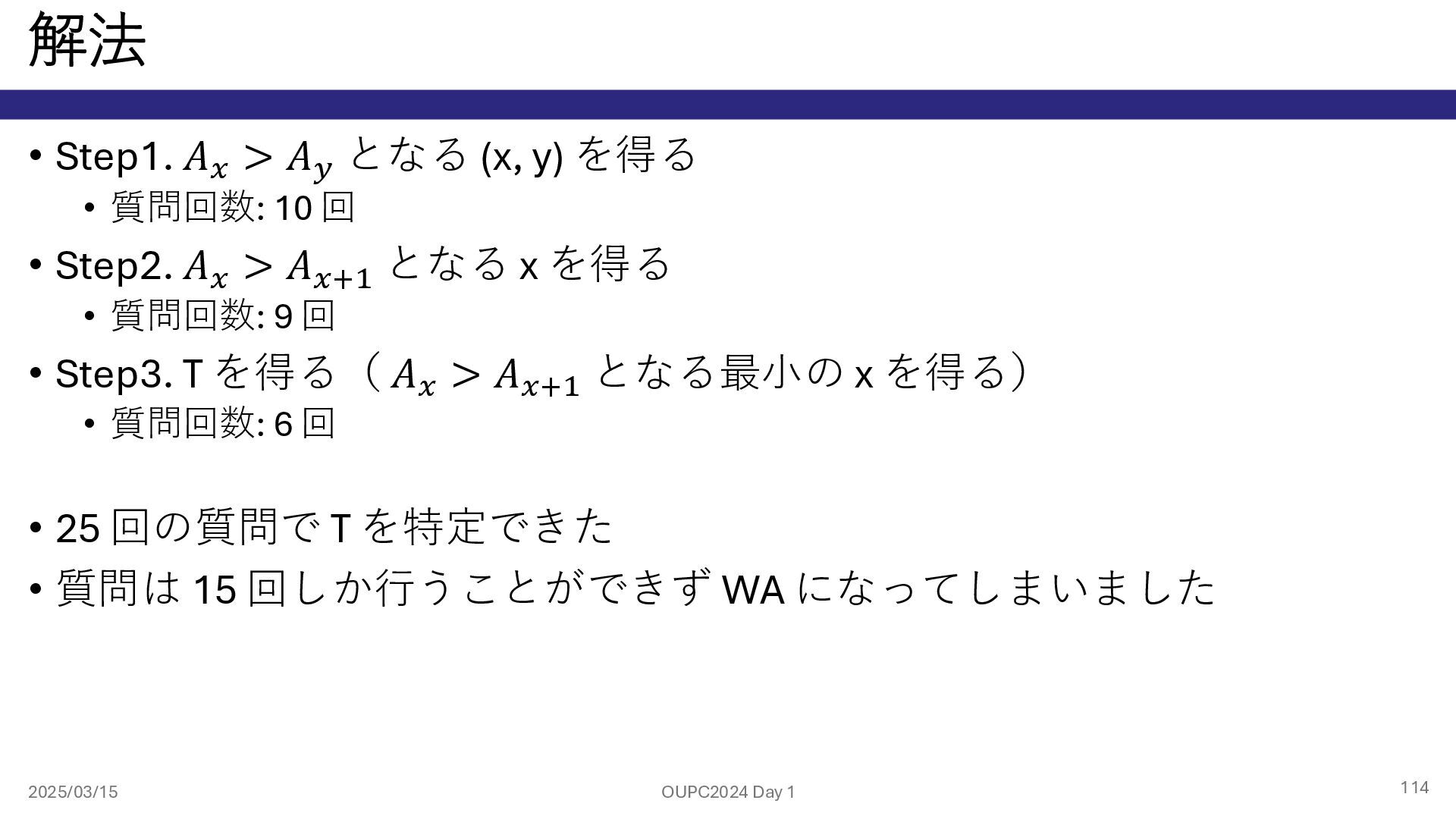 , 𝑔 𝑆2 , 𝑔 𝑆3 , 𝑔 𝑓 𝑆1 , 𝑆2 , 𝑔 𝑓 𝑆1 , 𝑆3 , 𝑔 𝑓 𝑆2 , 𝑆3 , 𝑔 𝑓 𝑓 𝑆1 , 𝑆2 , 𝑆3 の7つが分かればよくてこれは再帰で求まる • 𝑂(7𝐾) (最初𝐾 ≤ 9にしてて遅い言語にだけメモ化を要求しそうだったので8になった) 2025/03/15 OUPC2024 Day 1 56 𝑔 𝑆 = 全体 − 𝑆1 = 𝑆2 ≠ 𝑆3 のとき − 𝑆1 = 𝑆3 ≠ 𝑆2 − 𝑆2 = 𝑆3 ≠ 𝑆1 − 𝑆1 = 𝑆2 = 𝑆3 = 𝑔 𝑆1 𝑔 𝑆2 𝑔 𝑆3 − 𝑔 𝑓 𝑆1 , 𝑆2 𝑔 𝑆3 − 𝑔 𝑓 𝑓 𝑆1 , 𝑆2 , 𝑆3 − ቀ ቁ 𝑔 𝑓 𝑆1 , 𝑆3 𝑔 𝑆2 − 𝑔 𝑓 𝑓 𝑆1 , 𝑆2 , 𝑆3 − 𝑔 𝑓 𝑆2 , 𝑆3 𝑔 𝑆1 − 𝑔 𝑓 𝑓 𝑆1 , 𝑆2 , 𝑆3 − 𝑔 𝑓 𝑓 𝑆1 , 𝑆2 , 𝑆3 = 𝑔 𝑆1 𝑔 𝑆2 𝑔 𝑆3 − 𝑔 𝑓 𝑆1 , 𝑆2 𝑔 𝑆3 − 𝑔 𝑓 𝑆1 , 𝑆3 𝑔 𝑆2 − 𝑔 𝑓 𝑆2 , 𝑆3 𝑔 𝑆1 + 2𝑔 𝑓 𝑓 𝑆1 , 𝑆2 , 𝑆3