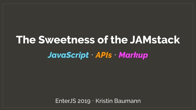 JavaScript & APIs & Markup Slides: https:/ /speakerdeck.com/kristinbaumann/the-sweetness-of- the-jamstack Practical Example: https:/ /github.com/kristinbaumann/jamstack-trees
