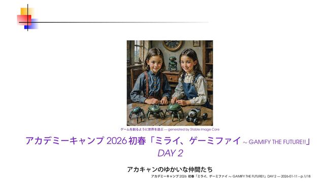 2026年1月11日(日)、早稲田大学で開催された アカデミーキャンプ2026 初春「ミライ、ゲーミファイ」DAY 2 で使用したスライドです。
