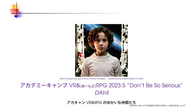 2023年5月6日(土)、物理 + オンラインで開催された、アカデミーキャンプ VR&(あーんど)RPG 2023.5 “Don’t Be So Serious” DAY 4 (宿泊明け) で使用したスライドです。