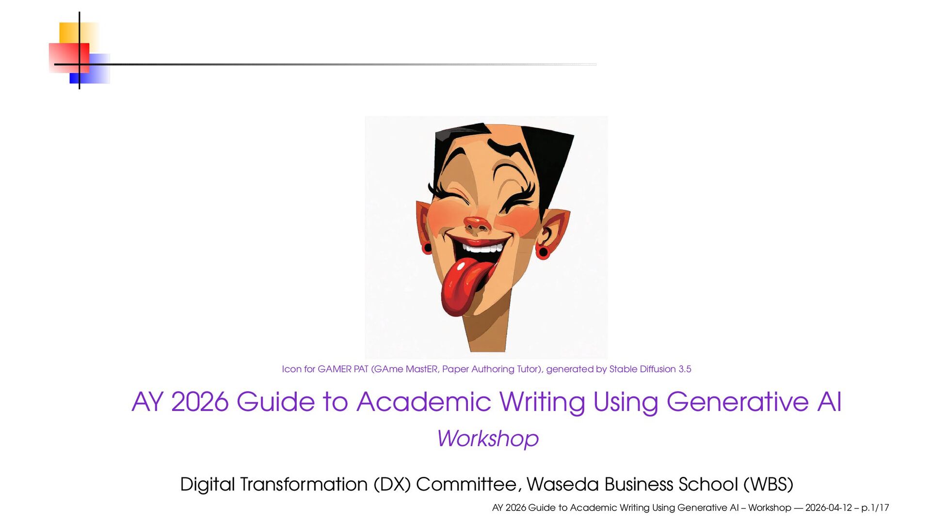 by Stable Diffusion 3.5 AY 2026 Guide to Academic Writing Using Generative AI Workshop Digital Transformation (DX) Committee, Waseda Business School (WBS) AY 2026 Guide to Academic Writing Using Generative AI – Workshop — 2026-04-12 – p.1/17
