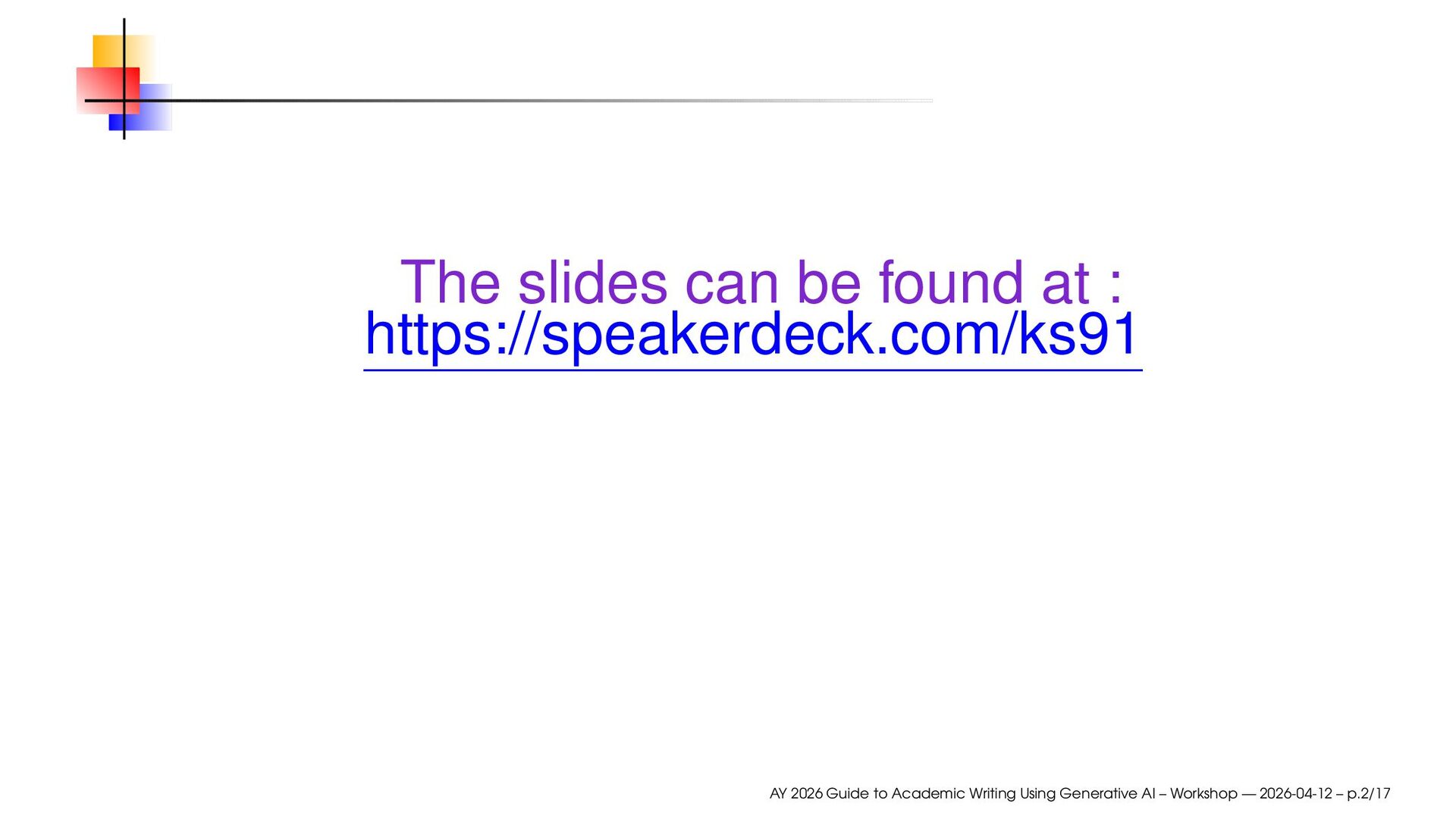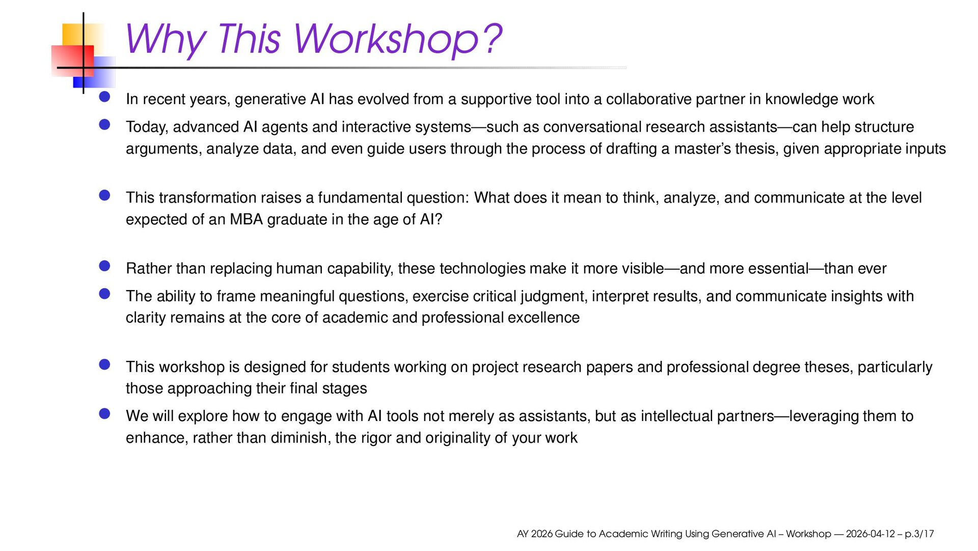from a supportive tool into a collaborative partner in knowledge work Today, advanced AI agents and interactive systems—such as conversational research assistants—can help structure arguments, analyze data, and even guide users through the process of drafting a master’s thesis, given appropriate inputs This transformation raises a fundamental question: What does it mean to think, analyze, and communicate at the level expected of an MBA graduate in the age of AI? Rather than replacing human capability, these technologies make it more visible—and more essential—than ever The ability to frame meaningful questions, exercise critical judgment, interpret results, and communicate insights with clarity remains at the core of academic and professional excellence This workshop is designed for students working on project research papers and professional degree theses, particularly those approaching their final stages We will explore how to engage with AI tools not merely as assistants, but as intellectual partners—leveraging them to enhance, rather than diminish, the rigor and originality of your work AY 2026 Guide to Academic Writing Using Generative AI – Workshop — 2026-04-12 – p.3/17