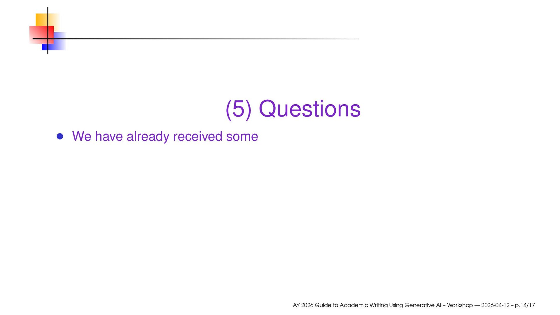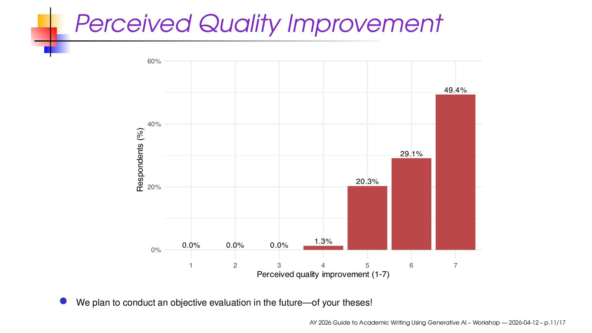 0% 20% 40% 60% 1 2 3 4 5 6 7 Perceived quality improvement (1-7) Respondents (%) We plan to conduct an objective evaluation in the future—of your theses! AY 2026 Guide to Academic Writing Using Generative AI – Workshop — 2026-04-12 – p.11/17