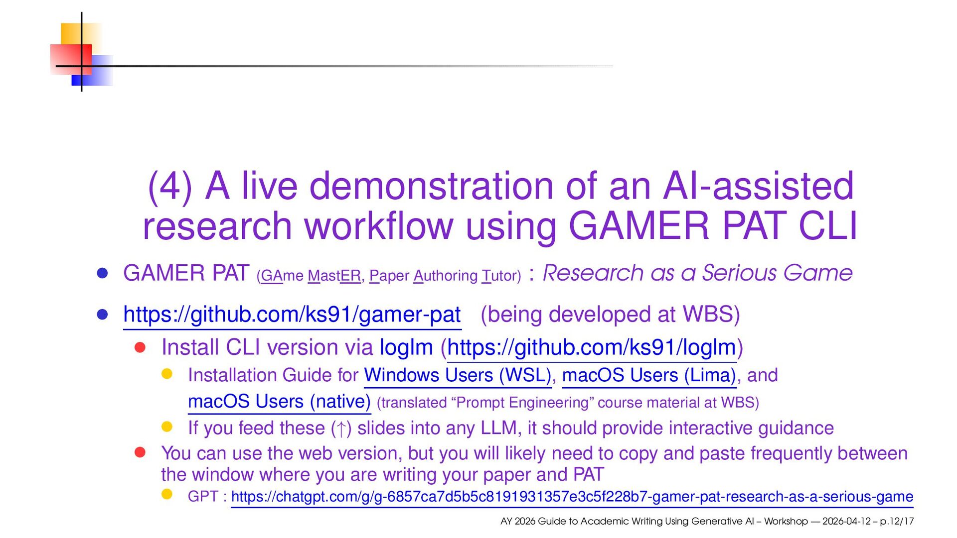 GAMER PAT CLI GAMER PAT (GAme MastER, Paper Authoring Tutor) : Research as a Serious Game https://github.com/ks91/gamer-pat (being developed at WBS) Install CLI version via loglm (https://github.com/ks91/loglm) Installation Guide for Windows Users (WSL), macOS Users (Lima), and macOS Users (native) (translated “Prompt Engineering” course material at WBS) If you feed these (↑) slides into any LLM, it should provide interactive guidance You can use the web version, but you will likely need to copy and paste frequently between the window where you are writing your paper and PAT GPT : https://chatgpt.com/g/g-6857ca7d5b5c8191931357e3c5f228b7-gamer-pat-research-as-a-serious-game AY 2026 Guide to Academic Writing Using Generative AI – Workshop — 2026-04-12 – p.12/17