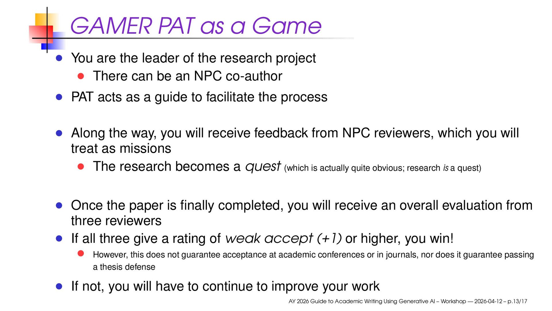 the research project There can be an NPC co-author PAT acts as a guide to facilitate the process Along the way, you will receive feedback from NPC reviewers, which you will treat as missions The research becomes a quest (which is actually quite obvious; research is a quest) Once the paper is finally completed, you will receive an overall evaluation from three reviewers If all three give a rating of weak accept (+1) or higher, you win! However, this does not guarantee acceptance at academic conferences or in journals, nor does it guarantee passing a thesis defense If not, you will have to continue to improve your work AY 2026 Guide to Academic Writing Using Generative AI – Workshop — 2026-04-12 – p.13/17