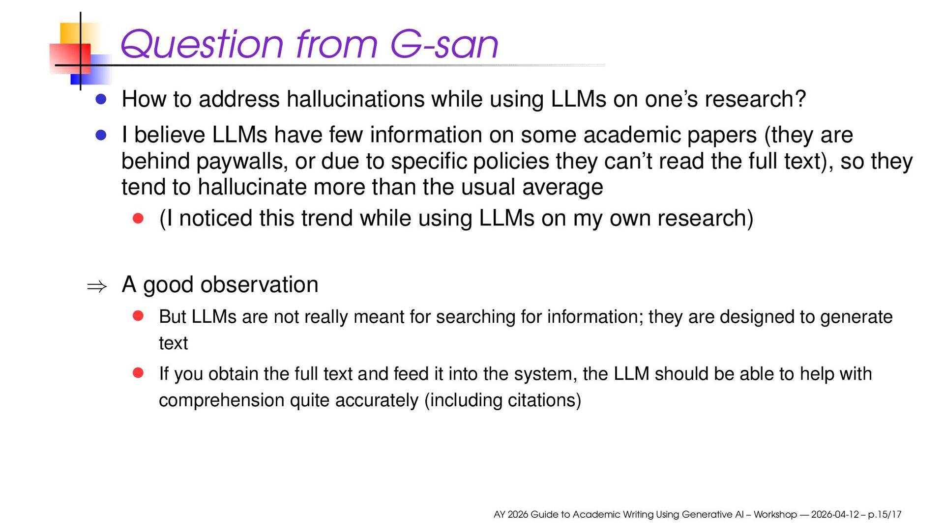 on one’s research? I believe LLMs have few information on some academic papers (they are behind paywalls, or due to specific policies they can’t read the full text), so they tend to hallucinate more than the usual average (I noticed this trend while using LLMs on my own research) ⇒ A good observation But LLMs are not really meant for searching for information; they are designed to generate text If you obtain the full text and feed it into the system, the LLM should be able to help with comprehension quite accurately (including citations) AY 2026 Guide to Academic Writing Using Generative AI – Workshop — 2026-04-12 – p.15/17
