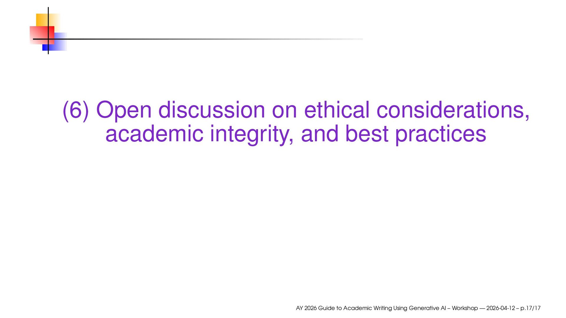 thesis? What are the current AI rules for thesis writing? (Can we directly copy the sentences from AI to our thesis?) ⇒ Why not? First, please ask your advisor Saito argues that, especially for students who are not native English speakers, is it not only by using the output of generative AI directly in their papers that we can finally stand on equal footing and engage in academic discourse? It goes without saying that you are fully responsible for the content you submit as your own AY 2026 Guide to Academic Writing Using Generative AI – Workshop — 2026-04-12 – p.16/17