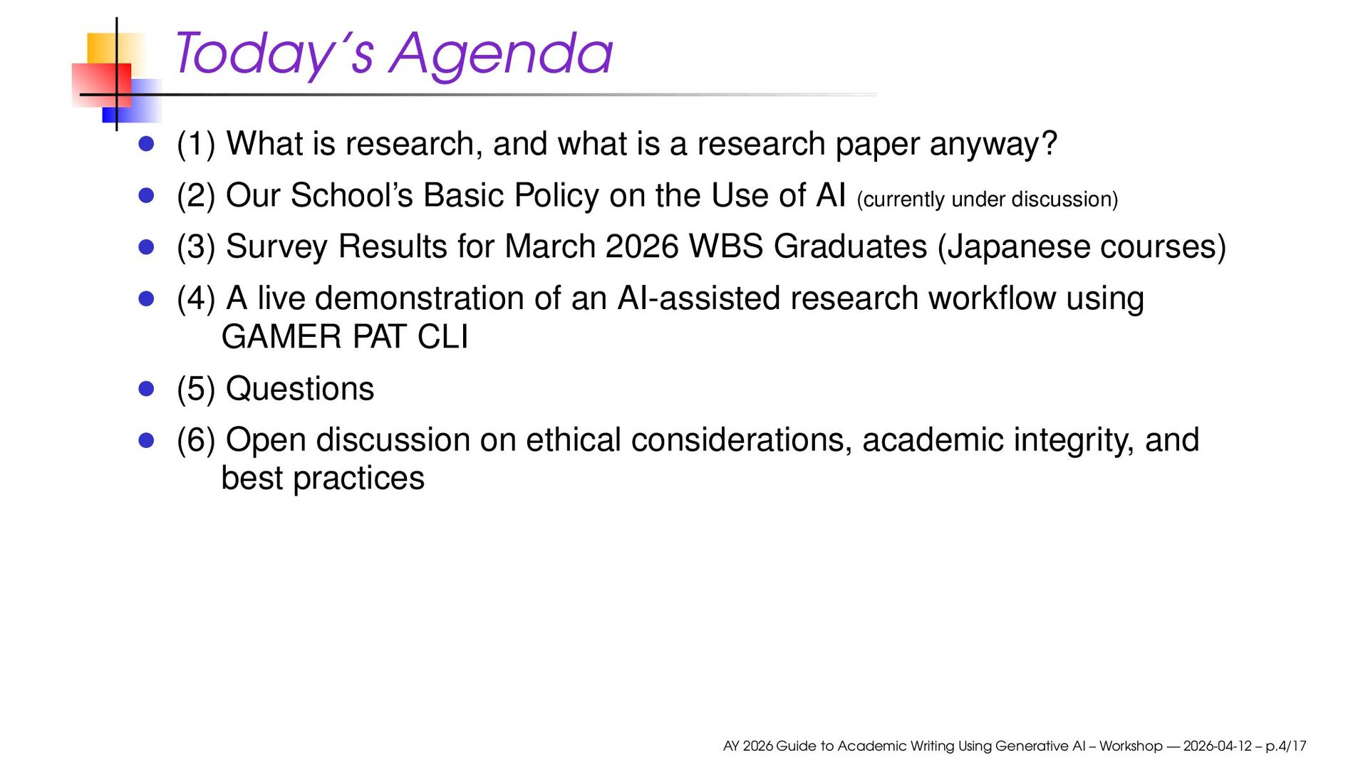 research paper anyway? (2) Our School’s Basic Policy on the Use of AI (currently under discussion) (3) Survey Results for March 2026 WBS Graduates (Japanese courses) (4) A live demonstration of an AI-assisted research workflow using GAMER PAT CLI (5) Questions (6) Open discussion on ethical considerations, academic integrity, and best practices AY 2026 Guide to Academic Writing Using Generative AI – Workshop — 2026-04-12 – p.4/17