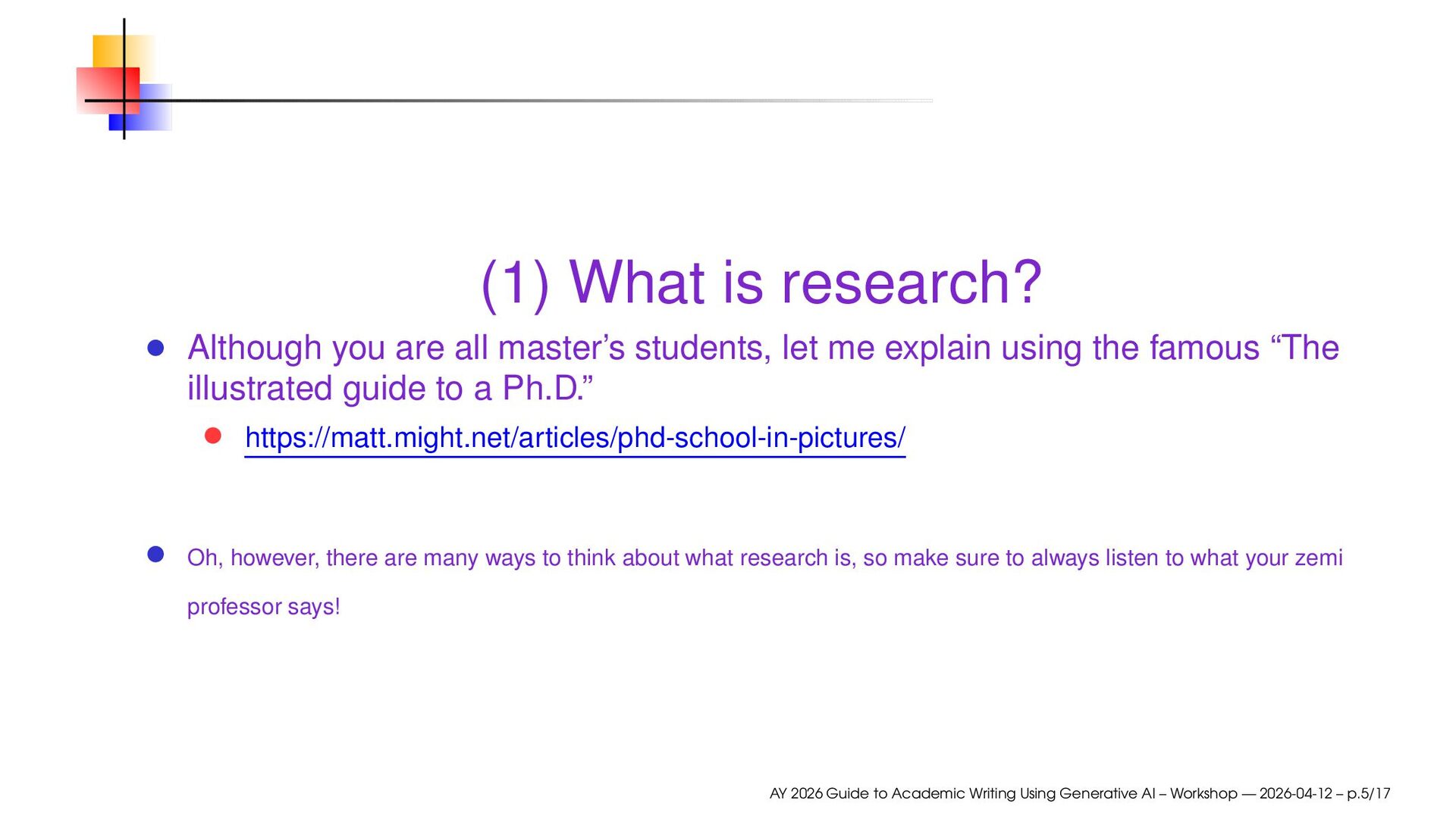 let me explain using the famous “The illustrated guide to a Ph.D.” https://matt.might.net/articles/phd-school-in-pictures/ Oh, however, there are many ways to think about what research is, so make sure to always listen to what your zemi professor says! AY 2026 Guide to Academic Writing Using Generative AI – Workshop — 2026-04-12 – p.5/17