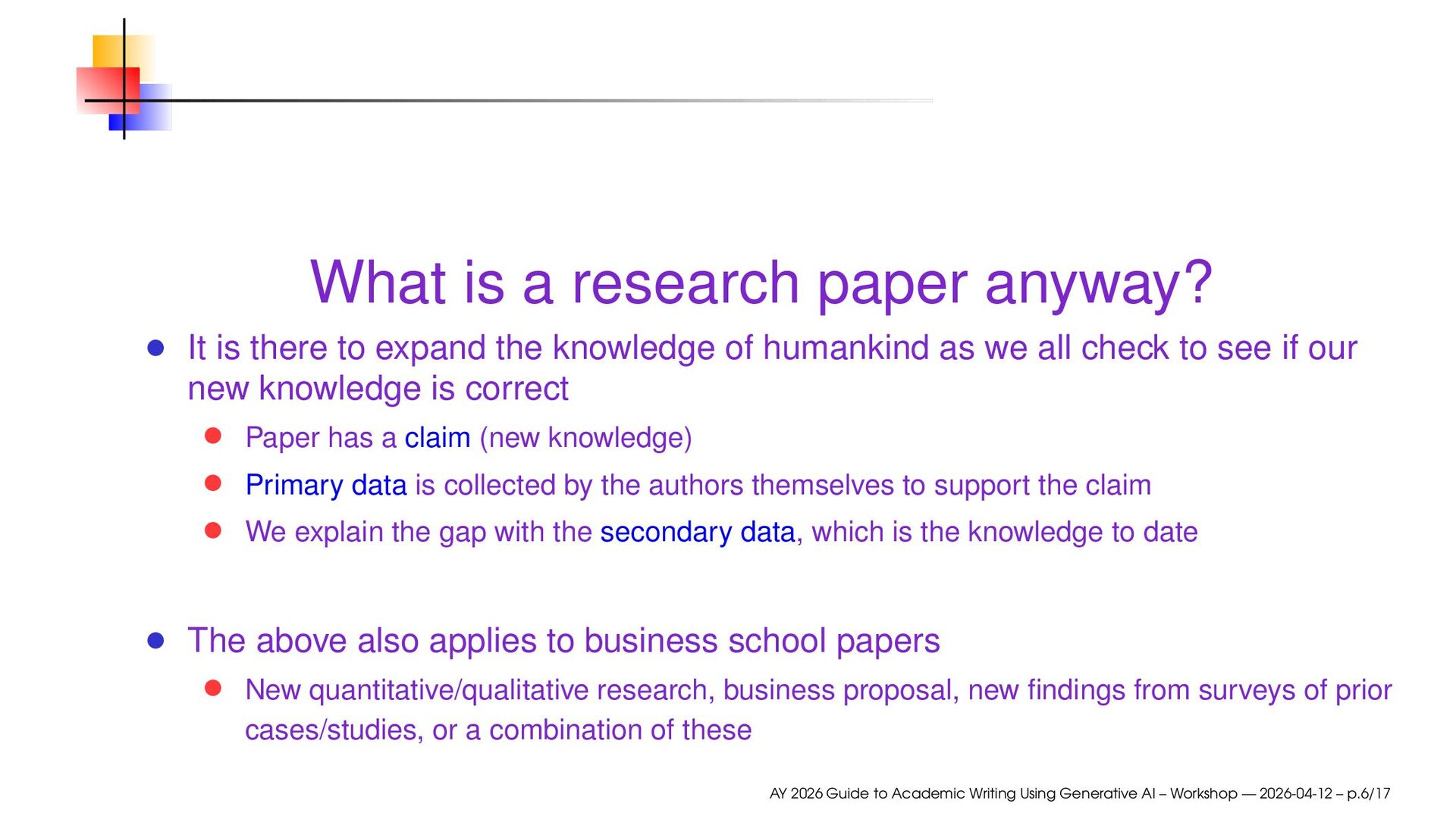 expand the knowledge of humankind as we all check to see if our new knowledge is correct Paper has a claim (new knowledge) Primary data is collected by the authors themselves to support the claim We explain the gap with the secondary data, which is the knowledge to date The above also applies to business school papers New quantitative/qualitative research, business proposal, new findings from surveys of prior cases/studies, or a combination of these AY 2026 Guide to Academic Writing Using Generative AI – Workshop — 2026-04-12 – p.6/17