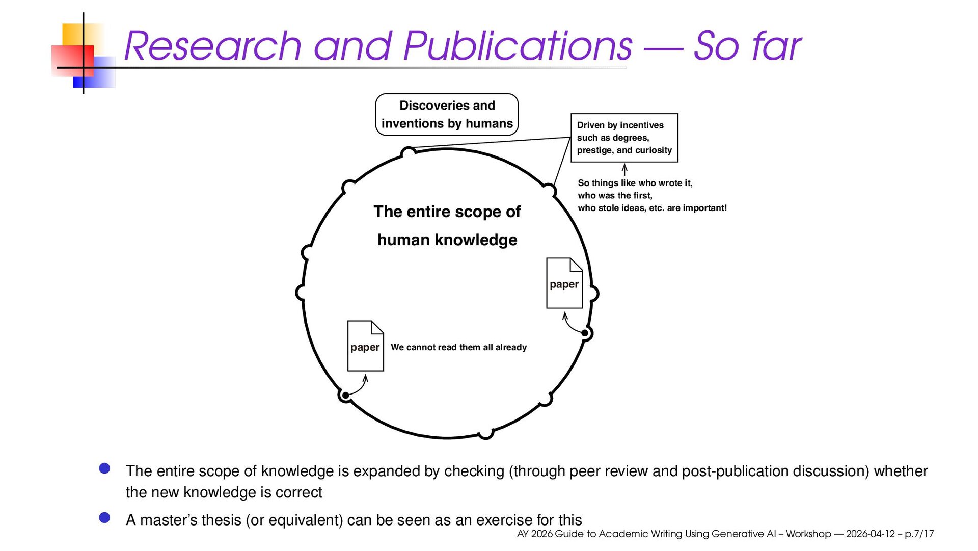 humans The entire scope of human knowledge paper paper We cannot read them all already Driven by incentives such as degrees, prestige, and curiosity ɹɹɹ So things like who wrote it, who was the first, who stole ideas, etc. are important! The entire scope of knowledge is expanded by checking (through peer review and post-publication discussion) whether the new knowledge is correct A master’s thesis (or equivalent) can be seen as an exercise for this AY 2026 Guide to Academic Writing Using Generative AI – Workshop — 2026-04-12 – p.7/17