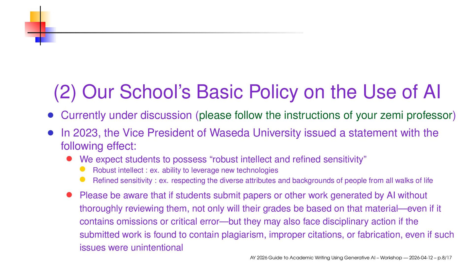 Currently under discussion (please follow the instructions of your zemi professor) In 2023, the Vice President of Waseda University issued a statement with the following effect: We expect students to possess “robust intellect and refined sensitivity” Robust intellect : ex. ability to leverage new technologies Refined sensitivity : ex. respecting the diverse attributes and backgrounds of people from all walks of life Please be aware that if students submit papers or other work generated by AI without thoroughly reviewing them, not only will their grades be based on that material—even if it contains omissions or critical error—but they may also face disciplinary action if the submitted work is found to contain plagiarism, improper citations, or fabrication, even if such issues were unintentional AY 2026 Guide to Academic Writing Using Generative AI – Workshop — 2026-04-12 – p.8/17