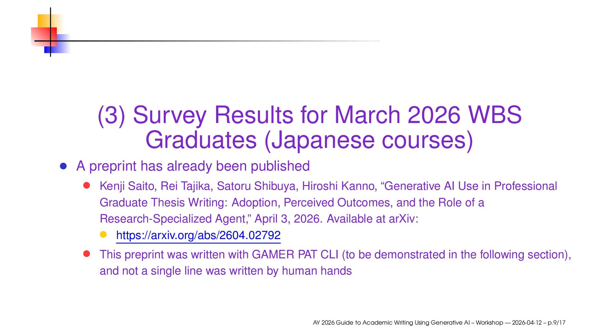 A preprint has already been published Kenji Saito, Rei Tajika, Satoru Shibuya, Hiroshi Kanno, “Generative AI Use in Professional Graduate Thesis Writing: Adoption, Perceived Outcomes, and the Role of a Research-Specialized Agent,” April 3, 2026. Available at arXiv: https://arxiv.org/abs/2604.02792 This preprint was written with GAMER PAT CLI (to be demonstrated in the following section), and not a single line was written by human hands AY 2026 Guide to Academic Writing Using Generative AI – Workshop — 2026-04-12 – p.9/17