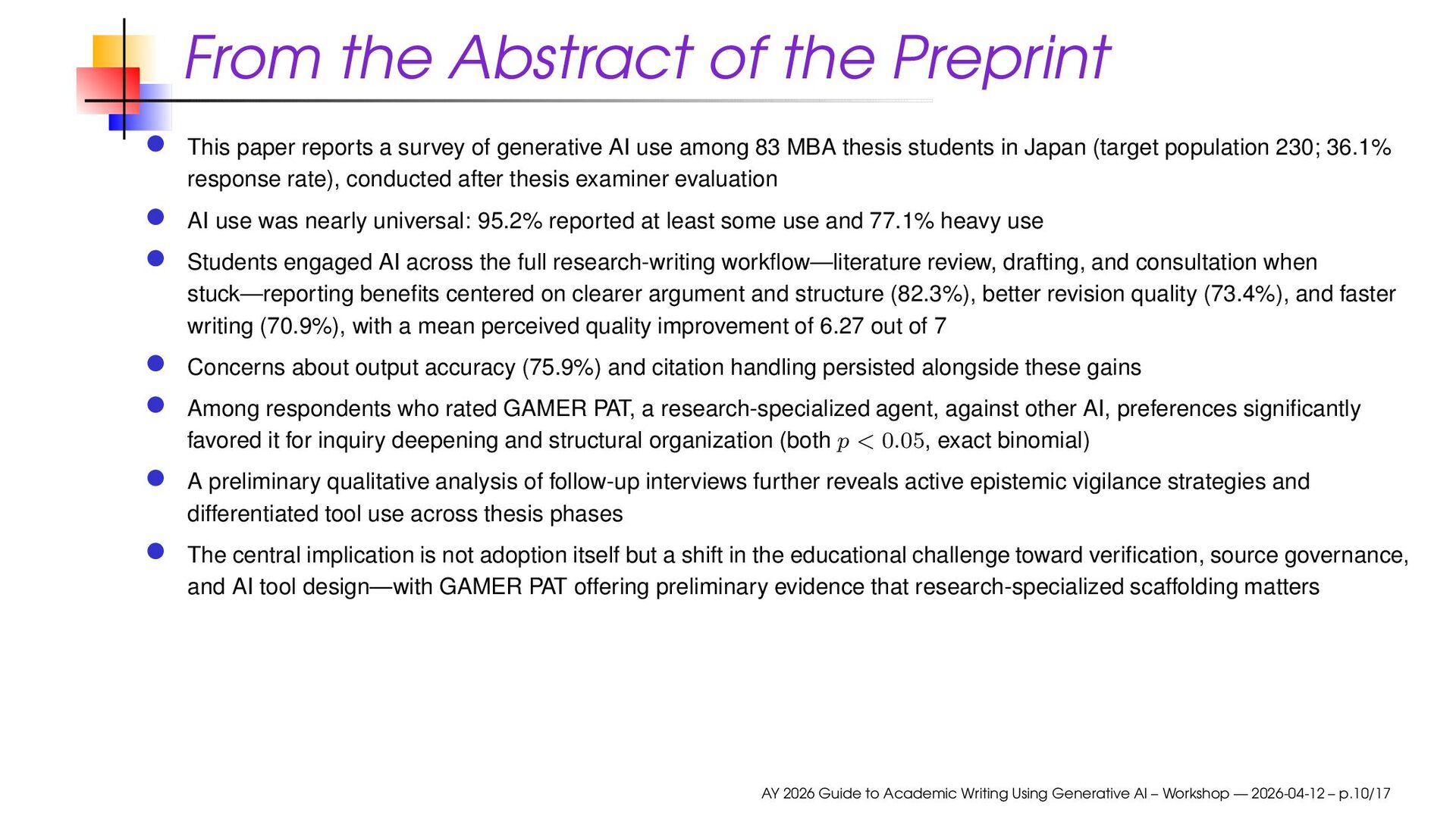 survey of generative AI use among 83 MBA thesis students in Japan (target population 230; 36.1% response rate), conducted after thesis examiner evaluation AI use was nearly universal: 95.2% reported at least some use and 77.1% heavy use Students engaged AI across the full research-writing workflow—literature review, drafting, and consultation when stuck—reporting benefits centered on clearer argument and structure (82.3%), better revision quality (73.4%), and faster writing (70.9%), with a mean perceived quality improvement of 6.27 out of 7 Concerns about output accuracy (75.9%) and citation handling persisted alongside these gains Among respondents who rated GAMER PAT, a research-specialized agent, against other AI, preferences significantly favored it for inquiry deepening and structural organization (both p < 0.05, exact binomial) A preliminary qualitative analysis of follow-up interviews further reveals active epistemic vigilance strategies and differentiated tool use across thesis phases The central implication is not adoption itself but a shift in the educational challenge toward verification, source governance, and AI tool design—with GAMER PAT offering preliminary evidence that research-specialized scaffolding matters AY 2026 Guide to Academic Writing Using Generative AI – Workshop — 2026-04-12 – p.10/17