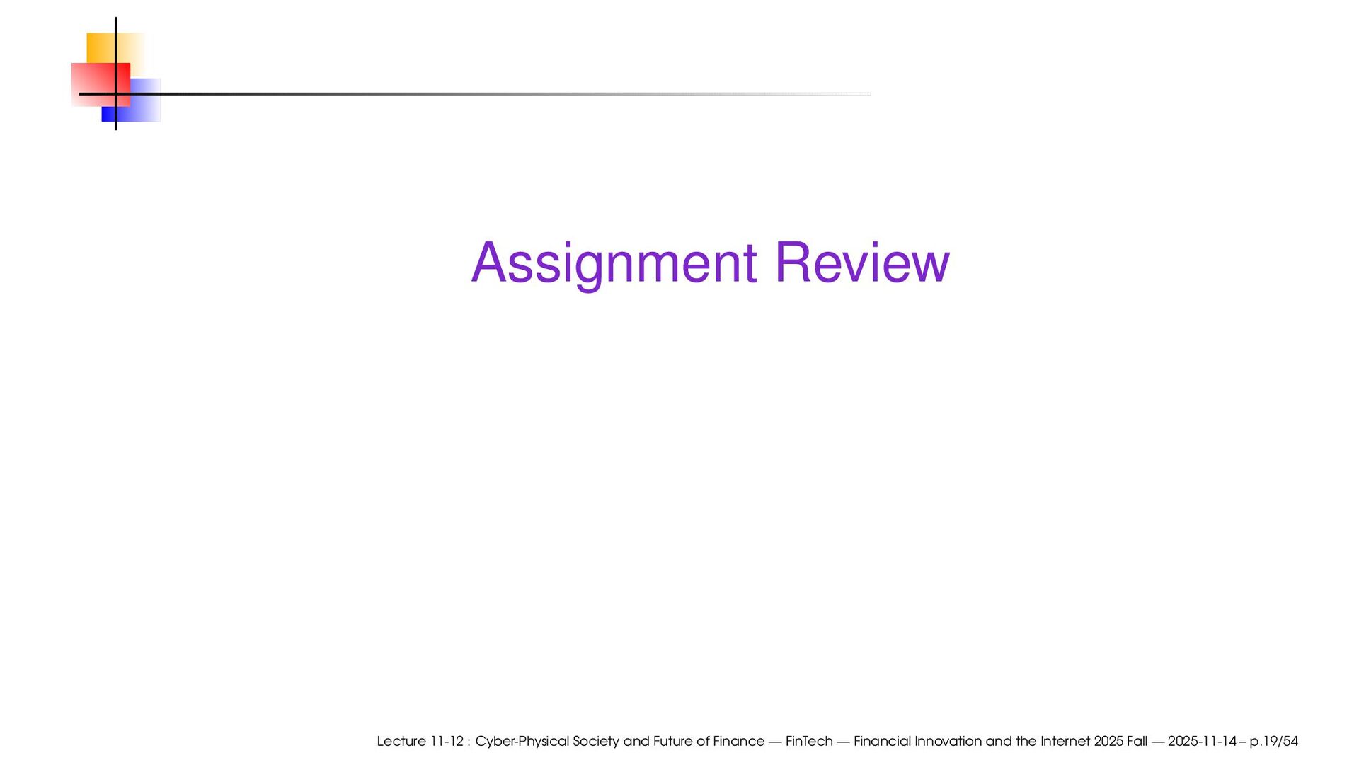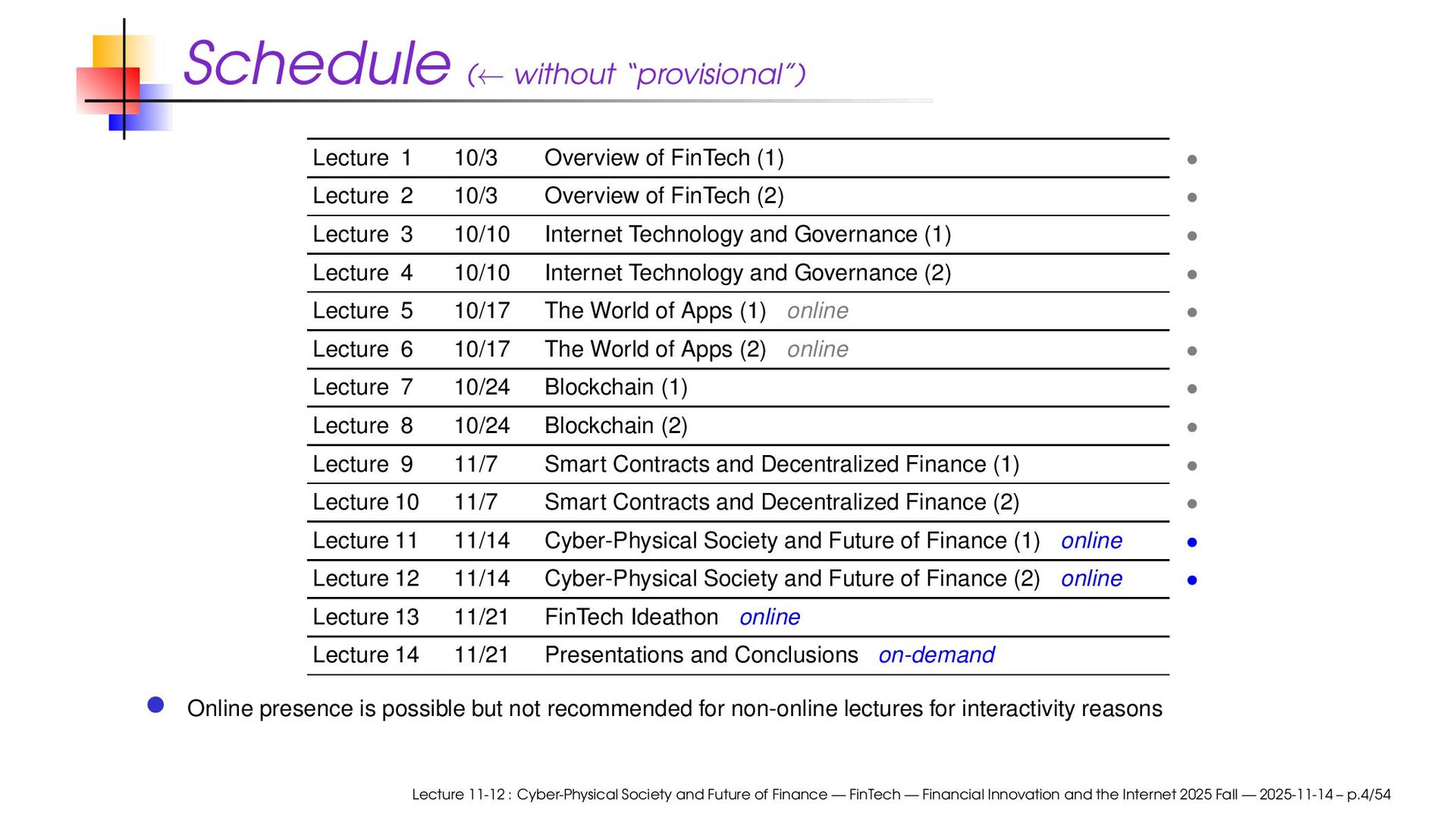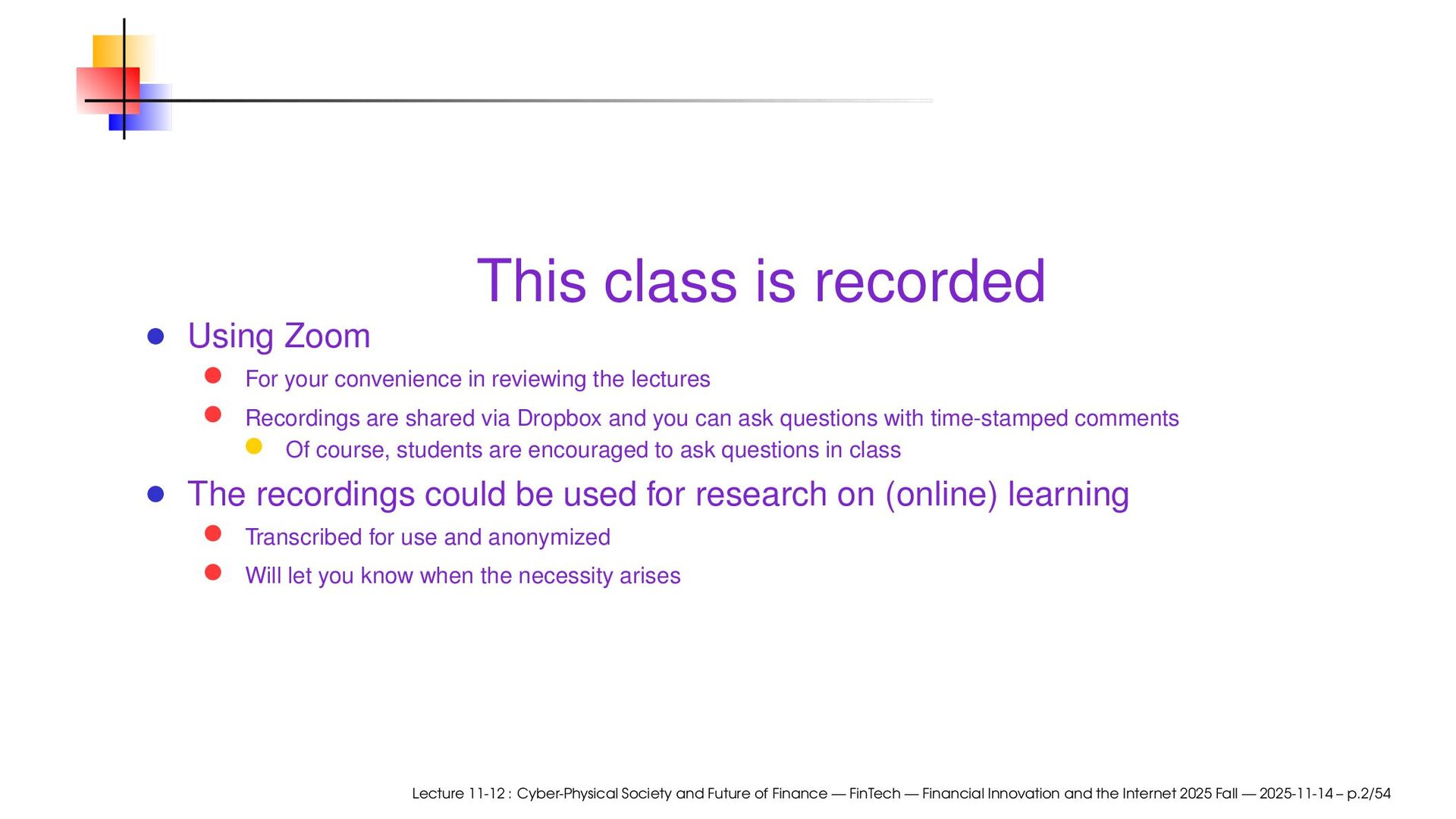 reviewing the lectures Recordings are shared via Dropbox and you can ask questions with time-stamped comments Of course, students are encouraged to ask questions in class The recordings could be used for research on (online) learning Transcribed for use and anonymized Will let you know when the necessity arises Lecture 11-12 : Cyber-Physical Society and Future of Finance — FinTech — Financial Innovation and the Internet 2025 Fall — 2025-11-14 – p.2/54