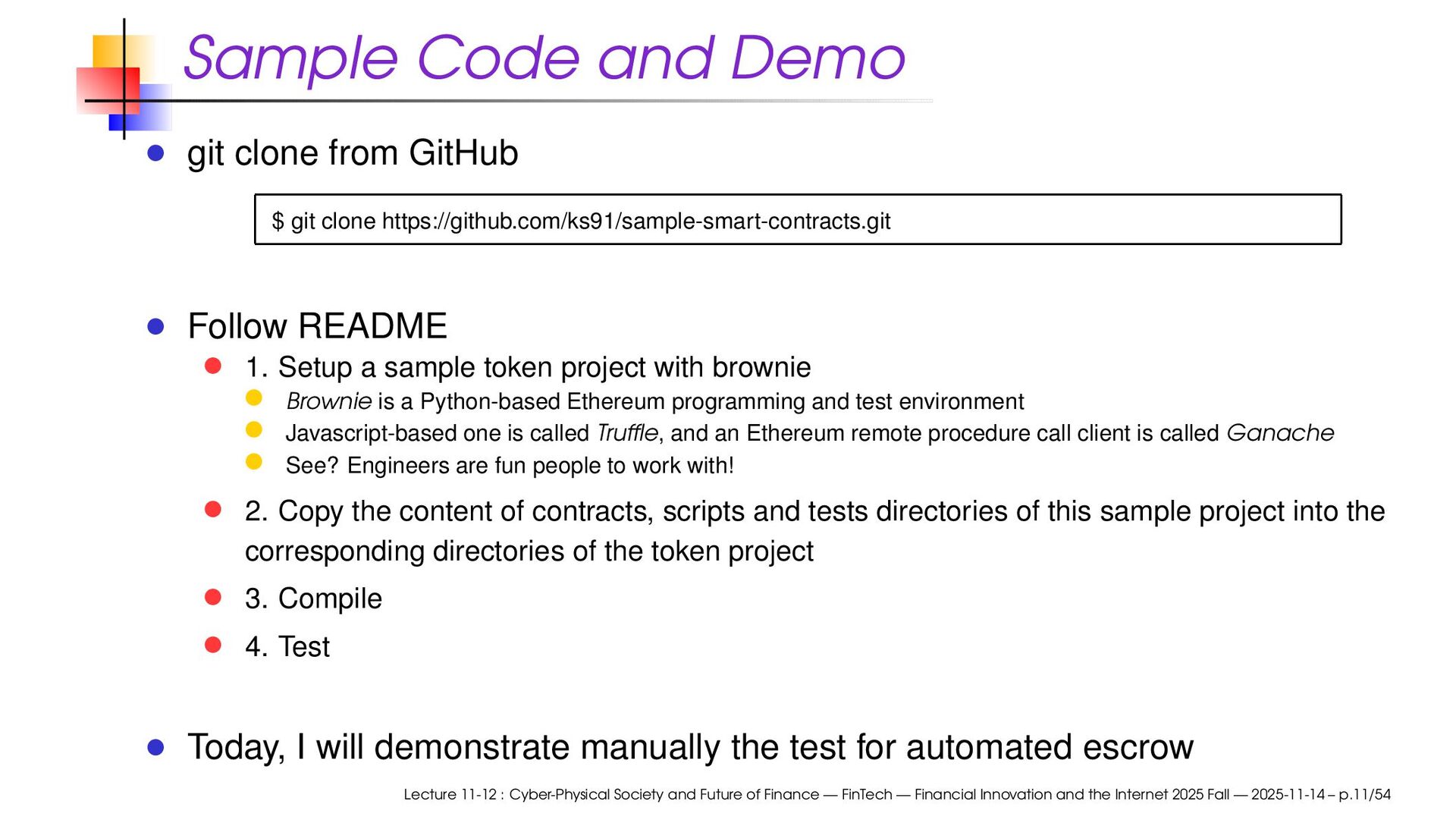 clone https://github.com/ks91/sample-smart-contracts.git Follow README 1. Setup a sample token project with brownie Brownie is a Python-based Ethereum programming and test environment Javascript-based one is called Truffle, and an Ethereum remote procedure call client is called Ganache See? Engineers are fun people to work with! 2. Copy the content of contracts, scripts and tests directories of this sample project into the corresponding directories of the token project 3. Compile 4. Test Today, I will demonstrate manually the test for automated escrow Lecture 11-12 : Cyber-Physical Society and Future of Finance — FinTech — Financial Innovation and the Internet 2025 Fall — 2025-11-14 – p.11/54