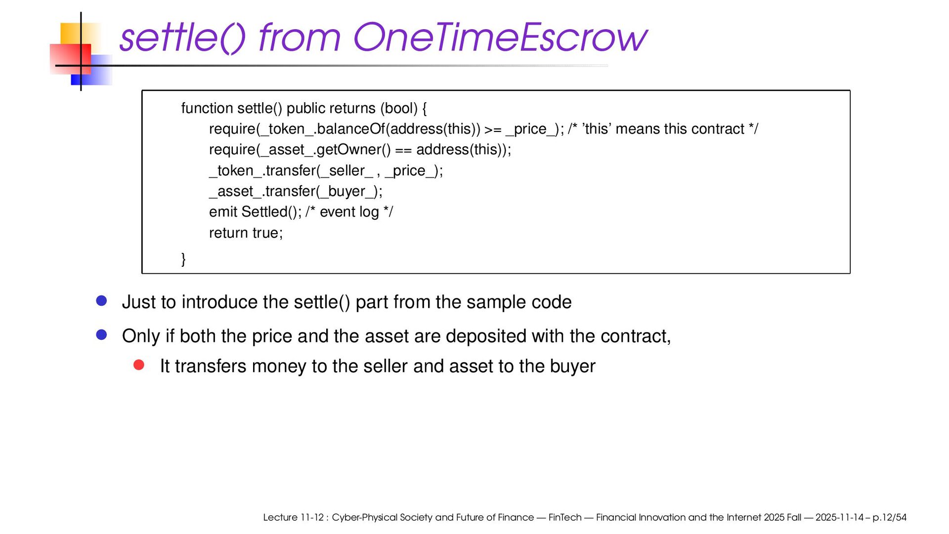 >= _price_); /* ’this’ means this contract */ require(_asset_.getOwner() == address(this)); _token_.transfer(_seller_ , _price_); _asset_.transfer(_buyer_); emit Settled(); /* event log */ return true; } Just to introduce the settle() part from the sample code Only if both the price and the asset are deposited with the contract, It transfers money to the seller and asset to the buyer Lecture 11-12 : Cyber-Physical Society and Future of Finance — FinTech — Financial Innovation and the Internet 2025 Fall — 2025-11-14 – p.12/54