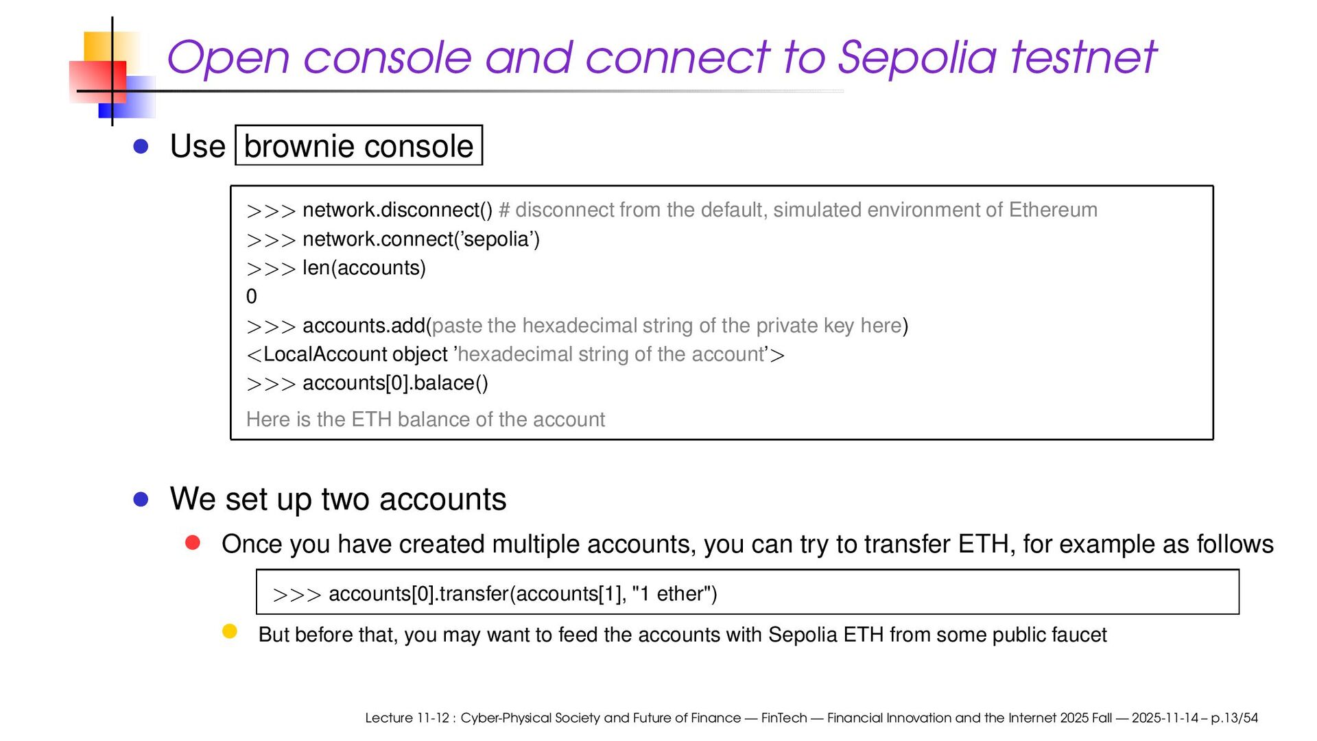 >>> network.disconnect() # disconnect from the default, simulated environment of Ethereum >>> network.connect(’sepolia’) >>> len(accounts) 0 >>> accounts.add(paste the hexadecimal string of the private key here) <LocalAccount object ’hexadecimal string of the account’> >>> accounts[0].balace() Here is the ETH balance of the account We set up two accounts Once you have created multiple accounts, you can try to transfer ETH, for example as follows >>> accounts[0].transfer(accounts[1], "1 ether") But before that, you may want to feed the accounts with Sepolia ETH from some public faucet Lecture 11-12 : Cyber-Physical Society and Future of Finance — FinTech — Financial Innovation and the Internet 2025 Fall — 2025-11-14 – p.13/54