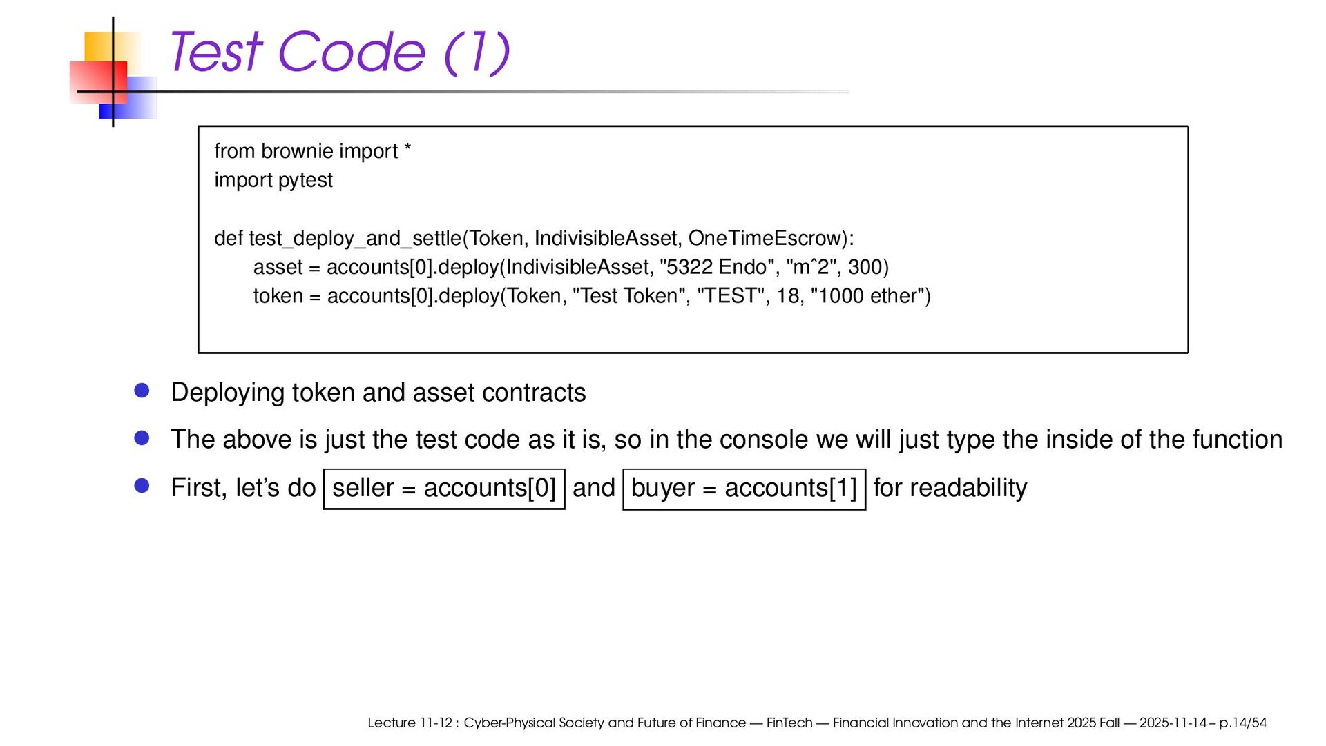 test_deploy_and_settle(Token, IndivisibleAsset, OneTimeEscrow): asset = accounts[0].deploy(IndivisibleAsset, "5322 Endo", "mˆ2", 300) token = accounts[0].deploy(Token, "Test Token", "TEST", 18, "1000 ether") Deploying token and asset contracts The above is just the test code as it is, so in the console we will just type the inside of the function First, let’s do seller = accounts[0] and buyer = accounts[1] for readability Lecture 11-12 : Cyber-Physical Society and Future of Finance — FinTech — Financial Innovation and the Internet 2025 Fall — 2025-11-14 – p.14/54