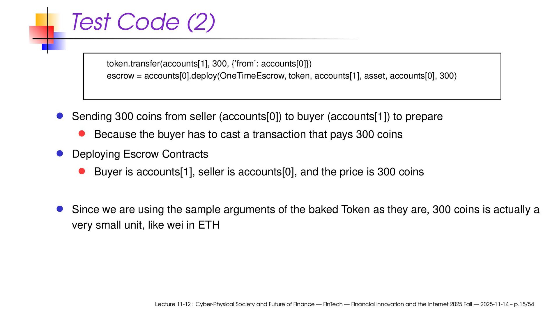 token, accounts[1], asset, accounts[0], 300) Sending 300 coins from seller (accounts[0]) to buyer (accounts[1]) to prepare Because the buyer has to cast a transaction that pays 300 coins Deploying Escrow Contracts Buyer is accounts[1], seller is accounts[0], and the price is 300 coins Since we are using the sample arguments of the baked Token as they are, 300 coins is actually a very small unit, like wei in ETH Lecture 11-12 : Cyber-Physical Society and Future of Finance — FinTech — Financial Innovation and the Internet 2025 Fall — 2025-11-14 – p.15/54