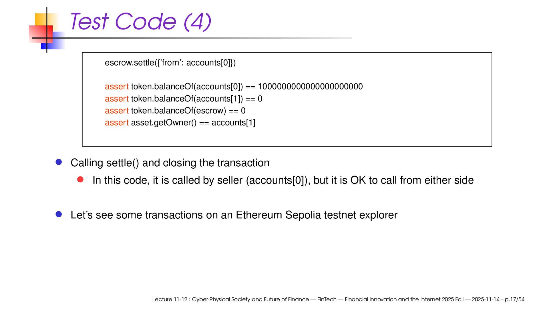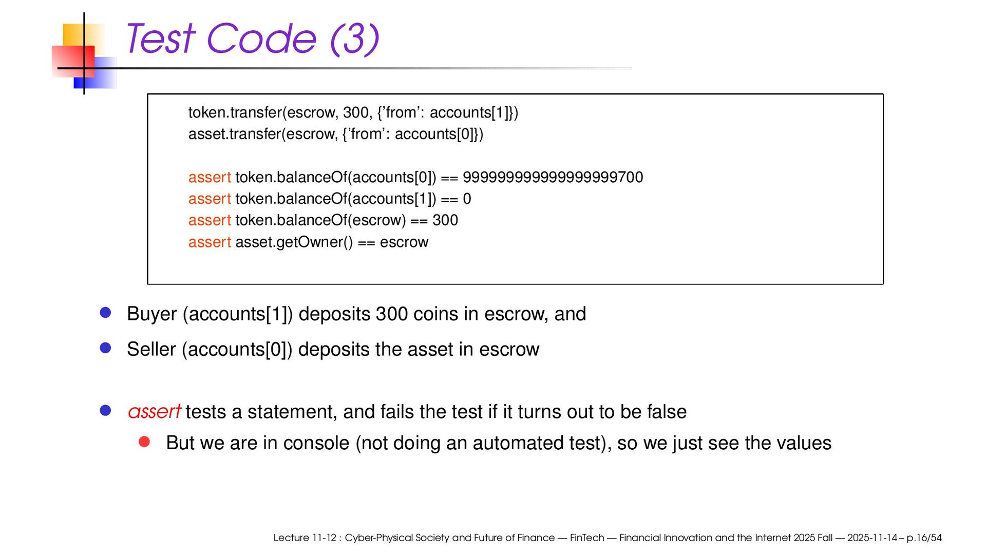 assert token.balanceOf(accounts[0]) == 999999999999999999700 assert token.balanceOf(accounts[1]) == 0 assert token.balanceOf(escrow) == 300 assert asset.getOwner() == escrow Buyer (accounts[1]) deposits 300 coins in escrow, and Seller (accounts[0]) deposits the asset in escrow assert tests a statement, and fails the test if it turns out to be false But we are in console (not doing an automated test), so we just see the values Lecture 11-12 : Cyber-Physical Society and Future of Finance — FinTech — Financial Innovation and the Internet 2025 Fall — 2025-11-14 – p.16/54