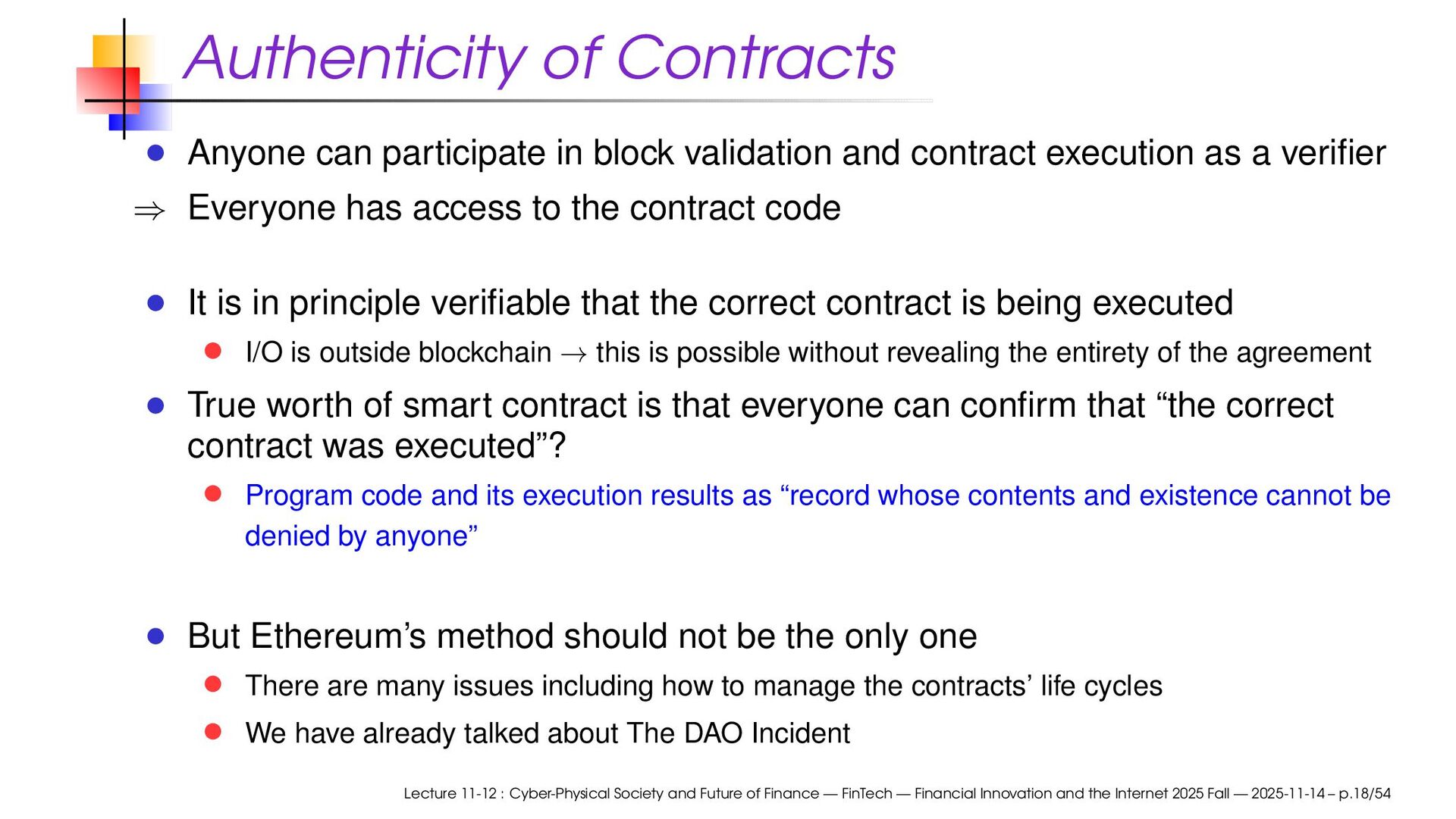 contract execution as a verifier ⇒ Everyone has access to the contract code It is in principle verifiable that the correct contract is being executed I/O is outside blockchain → this is possible without revealing the entirety of the agreement True worth of smart contract is that everyone can confirm that “the correct contract was executed”? Program code and its execution results as “record whose contents and existence cannot be denied by anyone” But Ethereum’s method should not be the only one There are many issues including how to manage the contracts’ life cycles We have already talked about The DAO Incident Lecture 11-12 : Cyber-Physical Society and Future of Finance — FinTech — Financial Innovation and the Internet 2025 Fall — 2025-11-14 – p.18/54