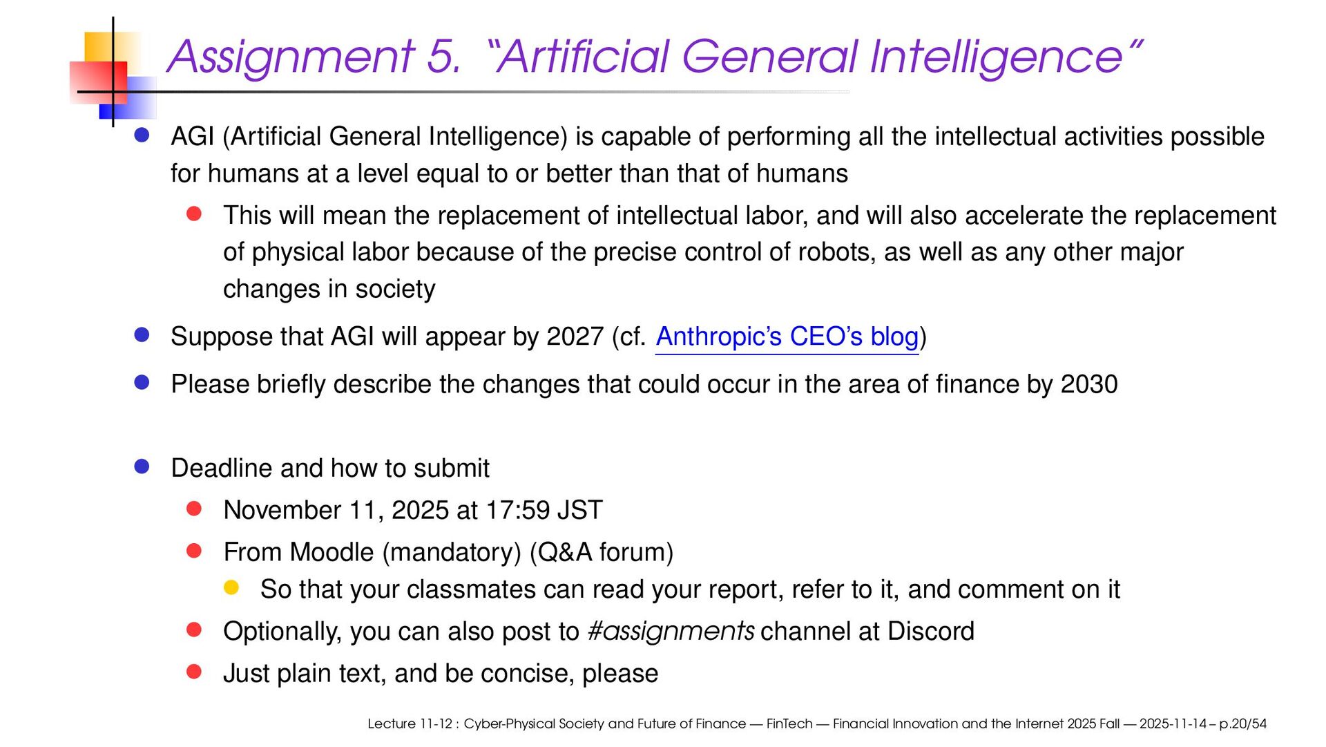 capable of performing all the intellectual activities possible for humans at a level equal to or better than that of humans This will mean the replacement of intellectual labor, and will also accelerate the replacement of physical labor because of the precise control of robots, as well as any other major changes in society Suppose that AGI will appear by 2027 (cf. Anthropic’s CEO’s blog) Please briefly describe the changes that could occur in the area of finance by 2030 Deadline and how to submit November 11, 2025 at 17:59 JST From Moodle (mandatory) (Q&A forum) So that your classmates can read your report, refer to it, and comment on it Optionally, you can also post to #assignments channel at Discord Just plain text, and be concise, please Lecture 11-12 : Cyber-Physical Society and Future of Finance — FinTech — Financial Innovation and the Internet 2025 Fall — 2025-11-14 – p.20/54