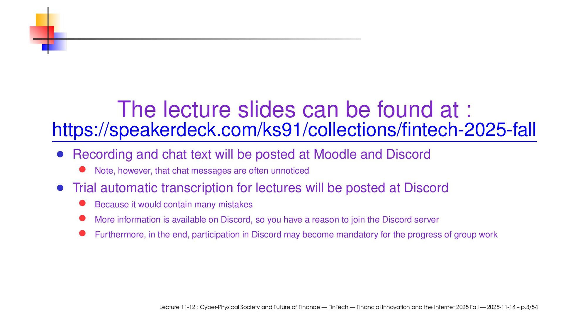 and chat text will be posted at Moodle and Discord Note, however, that chat messages are often unnoticed Trial automatic transcription for lectures will be posted at Discord Because it would contain many mistakes More information is available on Discord, so you have a reason to join the Discord server Furthermore, in the end, participation in Discord may become mandatory for the progress of group work Lecture 11-12 : Cyber-Physical Society and Future of Finance — FinTech — Financial Innovation and the Internet 2025 Fall — 2025-11-14 – p.3/54