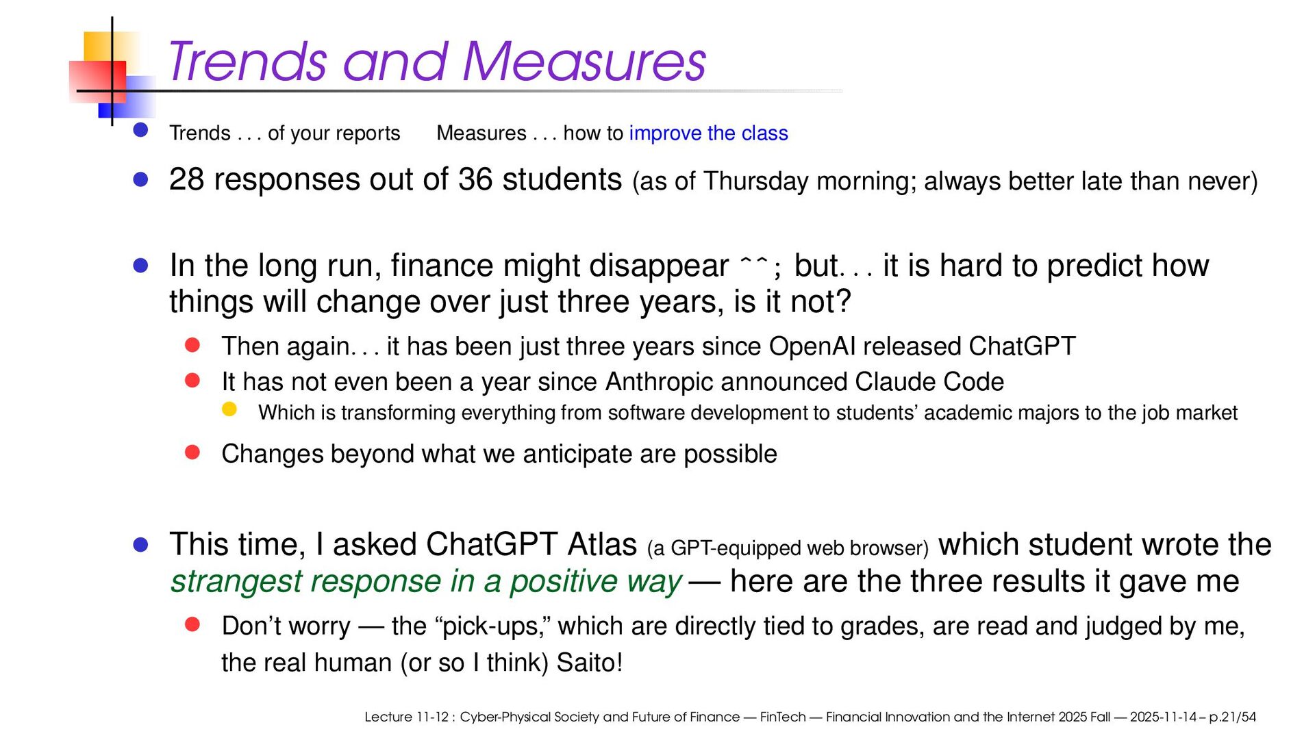 Measures . . . how to improve the class 28 responses out of 36 students (as of Thursday morning; always better late than never) In the long run, finance might disappear ^^; but. . . it is hard to predict how things will change over just three years, is it not? Then again . . . it has been just three years since OpenAI released ChatGPT It has not even been a year since Anthropic announced Claude Code Which is transforming everything from software development to students’ academic majors to the job market Changes beyond what we anticipate are possible This time, I asked ChatGPT Atlas (a GPT-equipped web browser) which student wrote the strangest response in a positive way — here are the three results it gave me Don’t worry — the “pick-ups,” which are directly tied to grades, are read and judged by me, the real human (or so I think) Saito! Lecture 11-12 : Cyber-Physical Society and Future of Finance — FinTech — Financial Innovation and the Internet 2025 Fall — 2025-11-14 – p.21/54