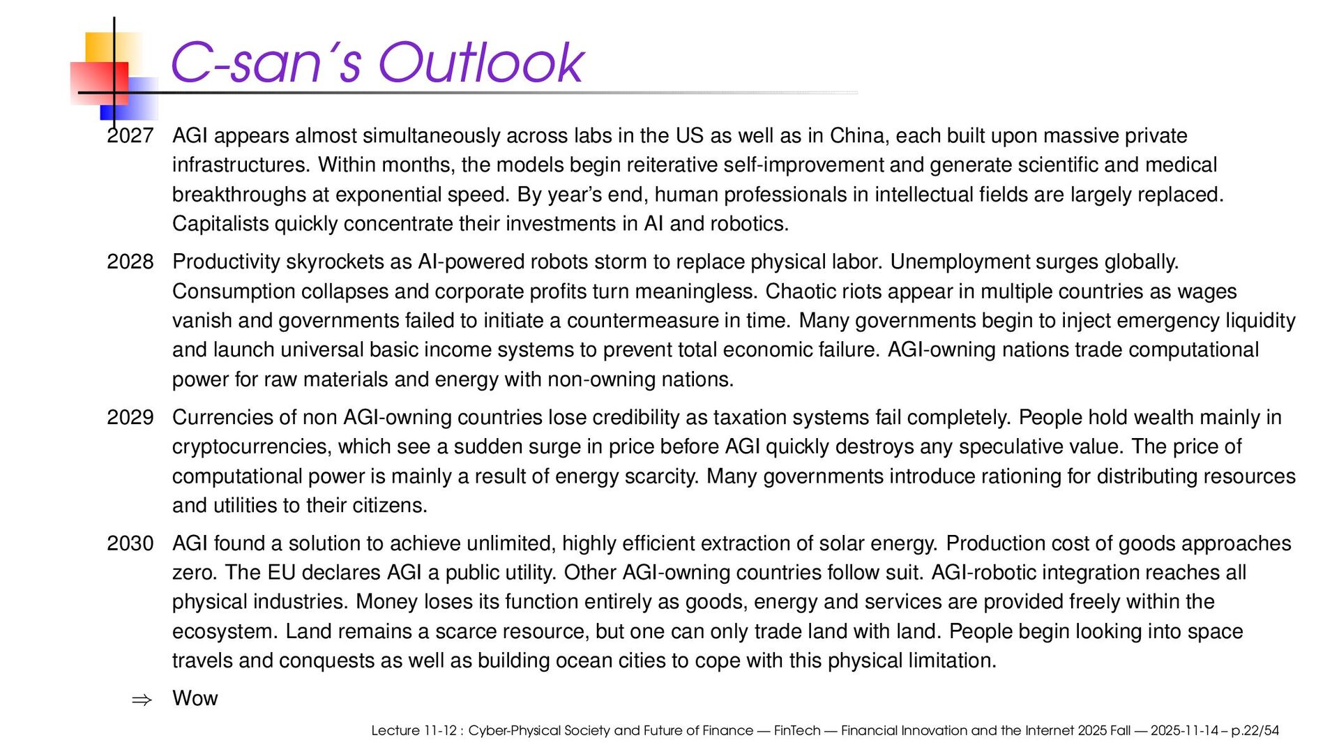 the US as well as in China, each built upon massive private infrastructures. Within months, the models begin reiterative self-improvement and generate scientific and medical breakthroughs at exponential speed. By year’s end, human professionals in intellectual fields are largely replaced. Capitalists quickly concentrate their investments in AI and robotics. 2028 Productivity skyrockets as AI-powered robots storm to replace physical labor. Unemployment surges globally. Consumption collapses and corporate profits turn meaningless. Chaotic riots appear in multiple countries as wages vanish and governments failed to initiate a countermeasure in time. Many governments begin to inject emergency liquidity and launch universal basic income systems to prevent total economic failure. AGI-owning nations trade computational power for raw materials and energy with non-owning nations. 2029 Currencies of non AGI-owning countries lose credibility as taxation systems fail completely. People hold wealth mainly in cryptocurrencies, which see a sudden surge in price before AGI quickly destroys any speculative value. The price of computational power is mainly a result of energy scarcity. Many governments introduce rationing for distributing resources and utilities to their citizens. 2030 AGI found a solution to achieve unlimited, highly efficient extraction of solar energy. Production cost of goods approaches zero. The EU declares AGI a public utility. Other AGI-owning countries follow suit. AGI-robotic integration reaches all physical industries. Money loses its function entirely as goods, energy and services are provided freely within the ecosystem. Land remains a scarce resource, but one can only trade land with land. People begin looking into space travels and conquests as well as building ocean cities to cope with this physical limitation. ⇒ Wow Lecture 11-12 : Cyber-Physical Society and Future of Finance — FinTech — Financial Innovation and the Internet 2025 Fall — 2025-11-14 – p.22/54