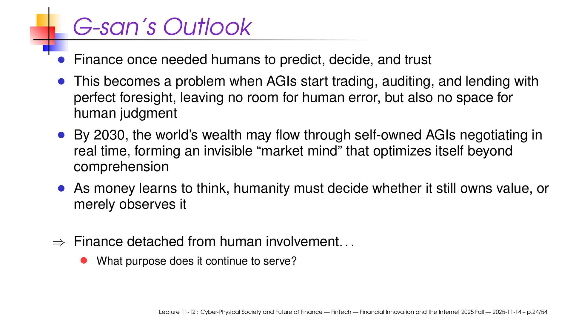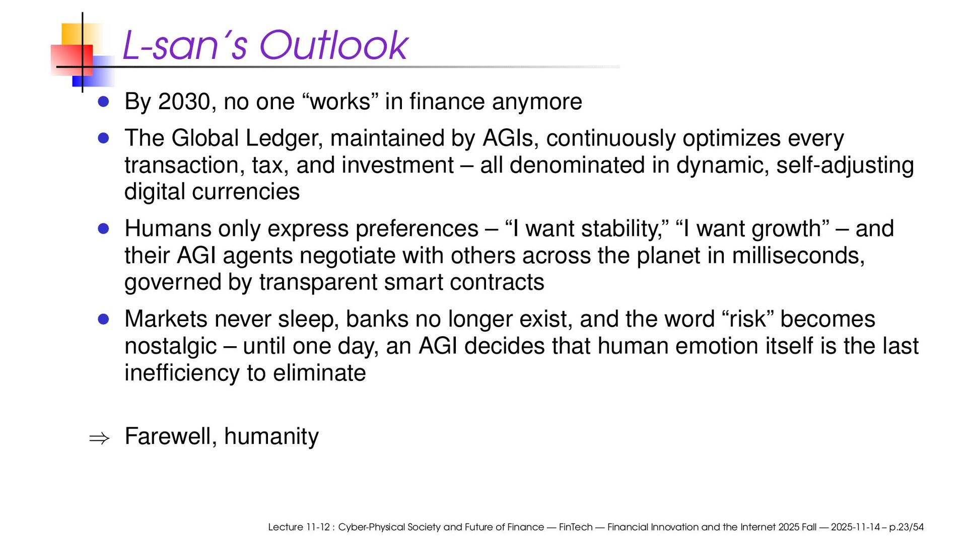 The Global Ledger, maintained by AGIs, continuously optimizes every transaction, tax, and investment – all denominated in dynamic, self-adjusting digital currencies Humans only express preferences – “I want stability,” “I want growth” – and their AGI agents negotiate with others across the planet in milliseconds, governed by transparent smart contracts Markets never sleep, banks no longer exist, and the word “risk” becomes nostalgic – until one day, an AGI decides that human emotion itself is the last inefficiency to eliminate ⇒ Farewell, humanity Lecture 11-12 : Cyber-Physical Society and Future of Finance — FinTech — Financial Innovation and the Internet 2025 Fall — 2025-11-14 – p.23/54
