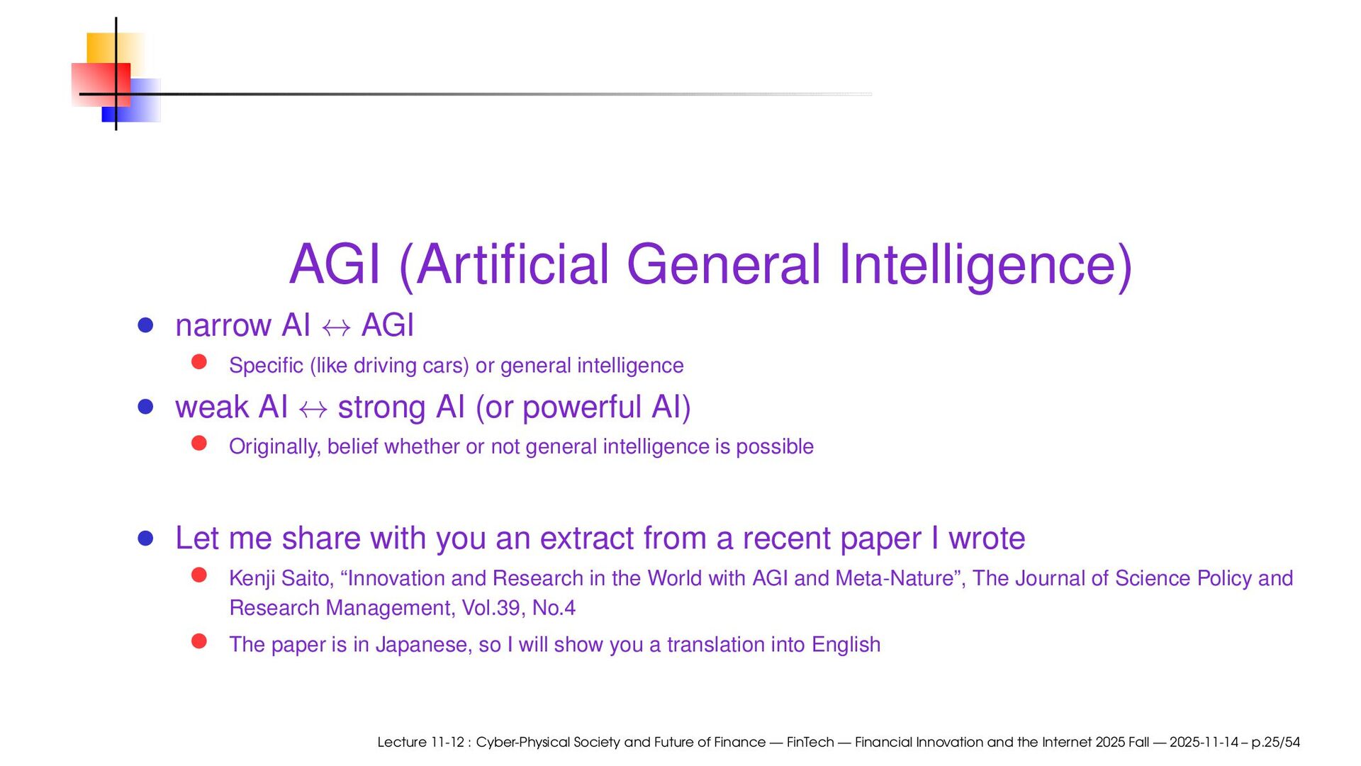 driving cars) or general intelligence weak AI ↔ strong AI (or powerful AI) Originally, belief whether or not general intelligence is possible Let me share with you an extract from a recent paper I wrote Kenji Saito, “Innovation and Research in the World with AGI and Meta-Nature”, The Journal of Science Policy and Research Management, Vol.39, No.4 The paper is in Japanese, so I will show you a translation into English Lecture 11-12 : Cyber-Physical Society and Future of Finance — FinTech — Financial Innovation and the Internet 2025 Fall — 2025-11-14 – p.25/54