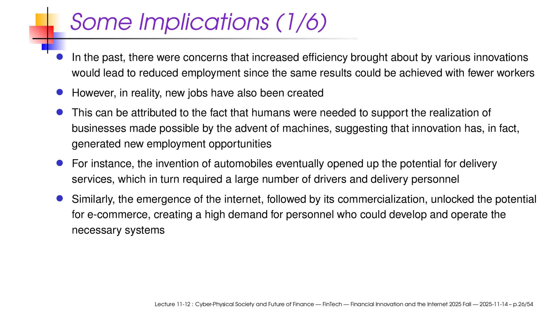 increased efficiency brought about by various innovations would lead to reduced employment since the same results could be achieved with fewer workers However, in reality, new jobs have also been created This can be attributed to the fact that humans were needed to support the realization of businesses made possible by the advent of machines, suggesting that innovation has, in fact, generated new employment opportunities For instance, the invention of automobiles eventually opened up the potential for delivery services, which in turn required a large number of drivers and delivery personnel Similarly, the emergence of the internet, followed by its commercialization, unlocked the potential for e-commerce, creating a high demand for personnel who could develop and operate the necessary systems Lecture 11-12 : Cyber-Physical Society and Future of Finance — FinTech — Financial Innovation and the Internet 2025 Fall — 2025-11-14 – p.26/54