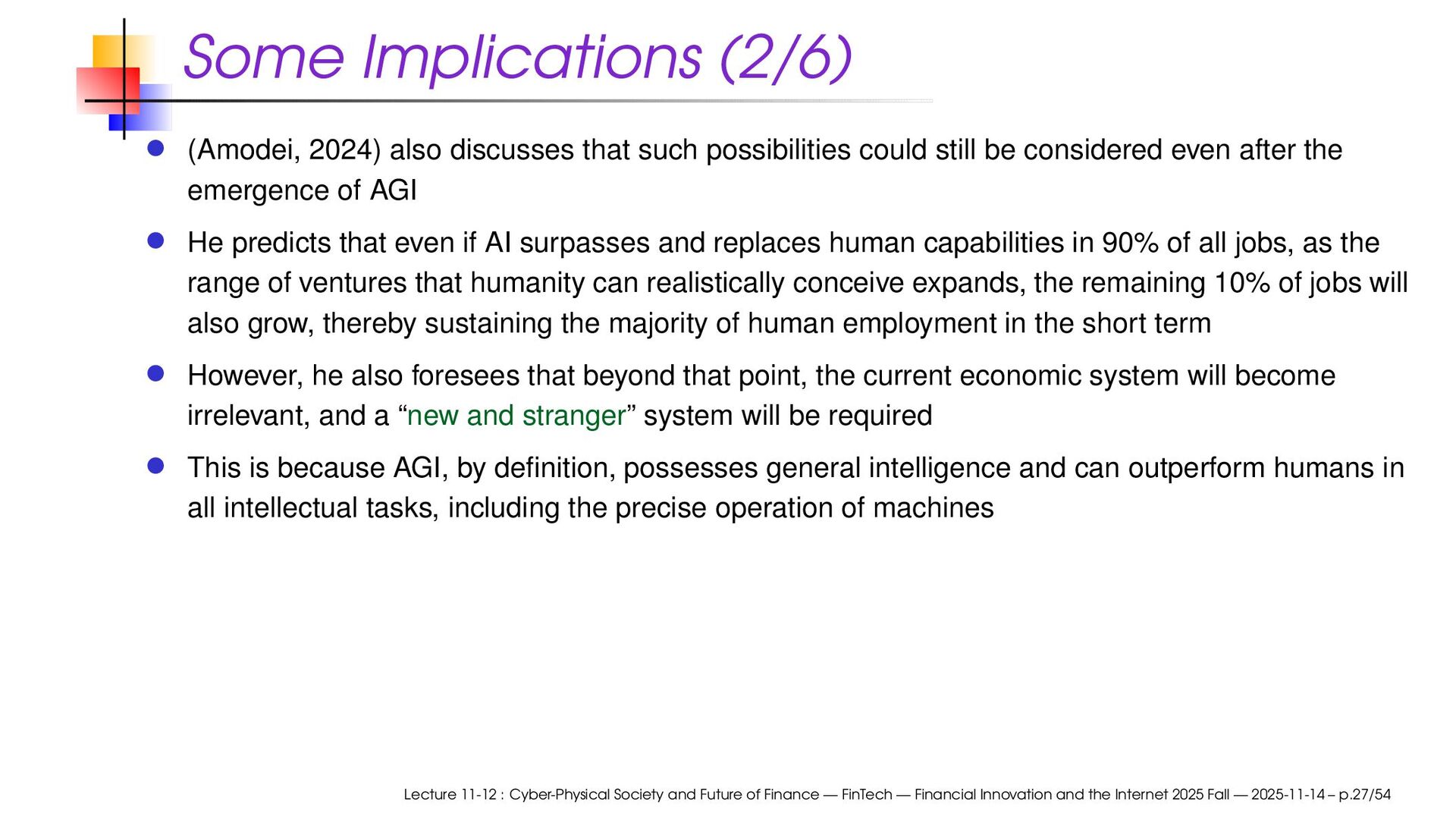could still be considered even after the emergence of AGI He predicts that even if AI surpasses and replaces human capabilities in 90% of all jobs, as the range of ventures that humanity can realistically conceive expands, the remaining 10% of jobs will also grow, thereby sustaining the majority of human employment in the short term However, he also foresees that beyond that point, the current economic system will become irrelevant, and a “new and stranger” system will be required This is because AGI, by definition, possesses general intelligence and can outperform humans in all intellectual tasks, including the precise operation of machines Lecture 11-12 : Cyber-Physical Society and Future of Finance — FinTech — Financial Innovation and the Internet 2025 Fall — 2025-11-14 – p.27/54