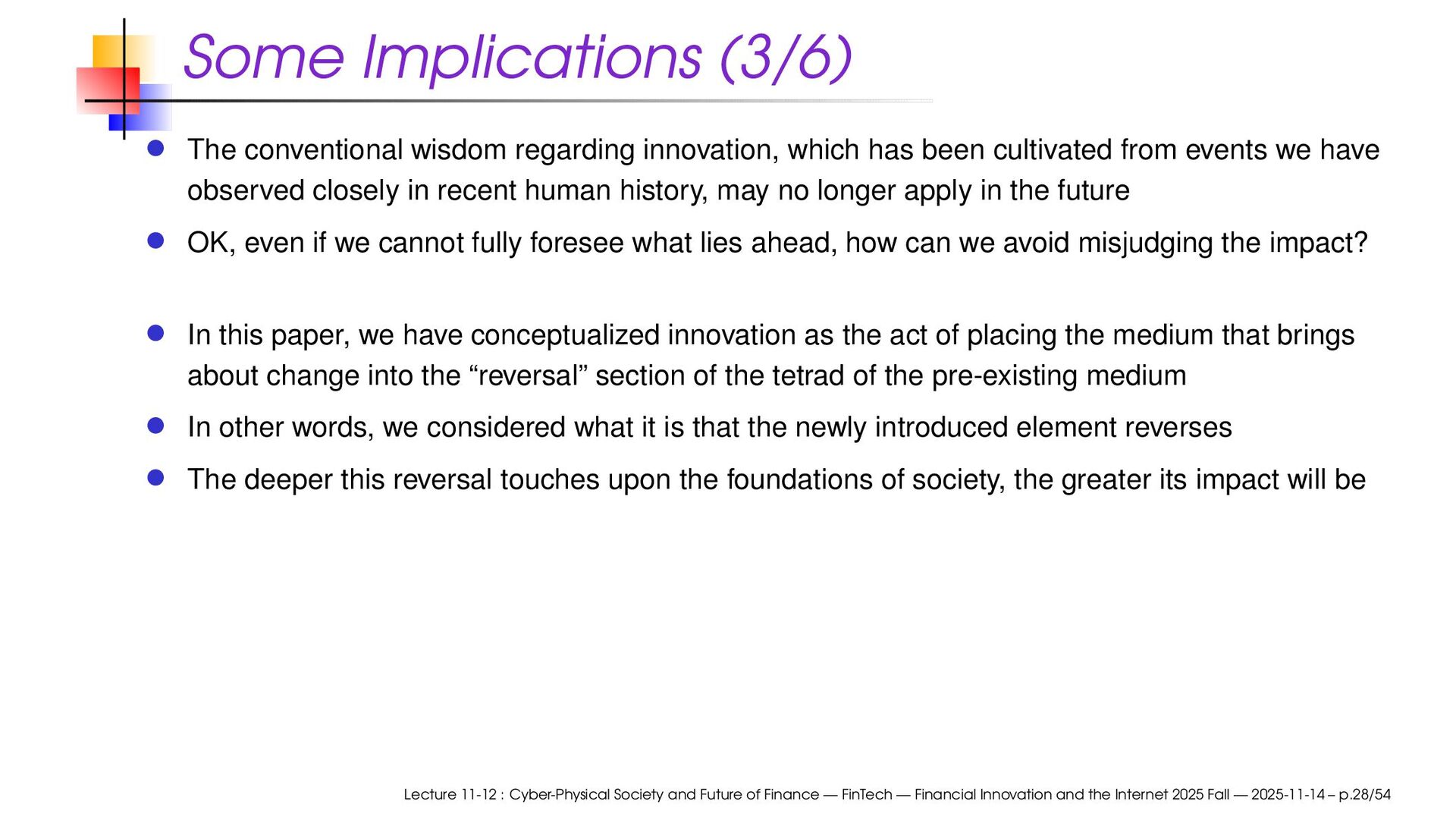 been cultivated from events we have observed closely in recent human history, may no longer apply in the future OK, even if we cannot fully foresee what lies ahead, how can we avoid misjudging the impact? In this paper, we have conceptualized innovation as the act of placing the medium that brings about change into the “reversal” section of the tetrad of the pre-existing medium In other words, we considered what it is that the newly introduced element reverses The deeper this reversal touches upon the foundations of society, the greater its impact will be Lecture 11-12 : Cyber-Physical Society and Future of Finance — FinTech — Financial Innovation and the Internet 2025 Fall — 2025-11-14 – p.28/54