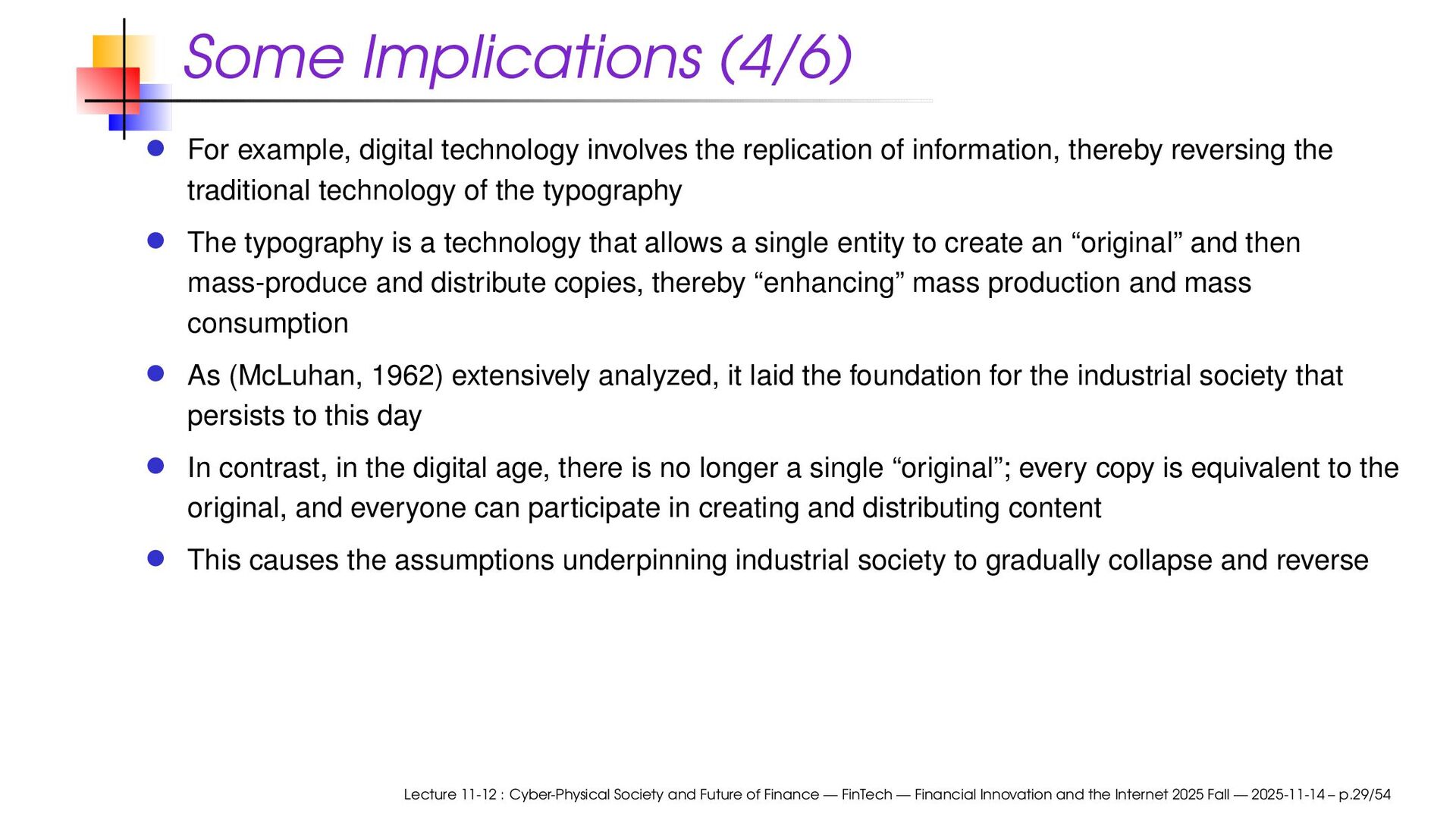 of information, thereby reversing the traditional technology of the typography The typography is a technology that allows a single entity to create an “original” and then mass-produce and distribute copies, thereby “enhancing” mass production and mass consumption As (McLuhan, 1962) extensively analyzed, it laid the foundation for the industrial society that persists to this day In contrast, in the digital age, there is no longer a single “original”; every copy is equivalent to the original, and everyone can participate in creating and distributing content This causes the assumptions underpinning industrial society to gradually collapse and reverse Lecture 11-12 : Cyber-Physical Society and Future of Finance — FinTech — Financial Innovation and the Internet 2025 Fall — 2025-11-14 – p.29/54