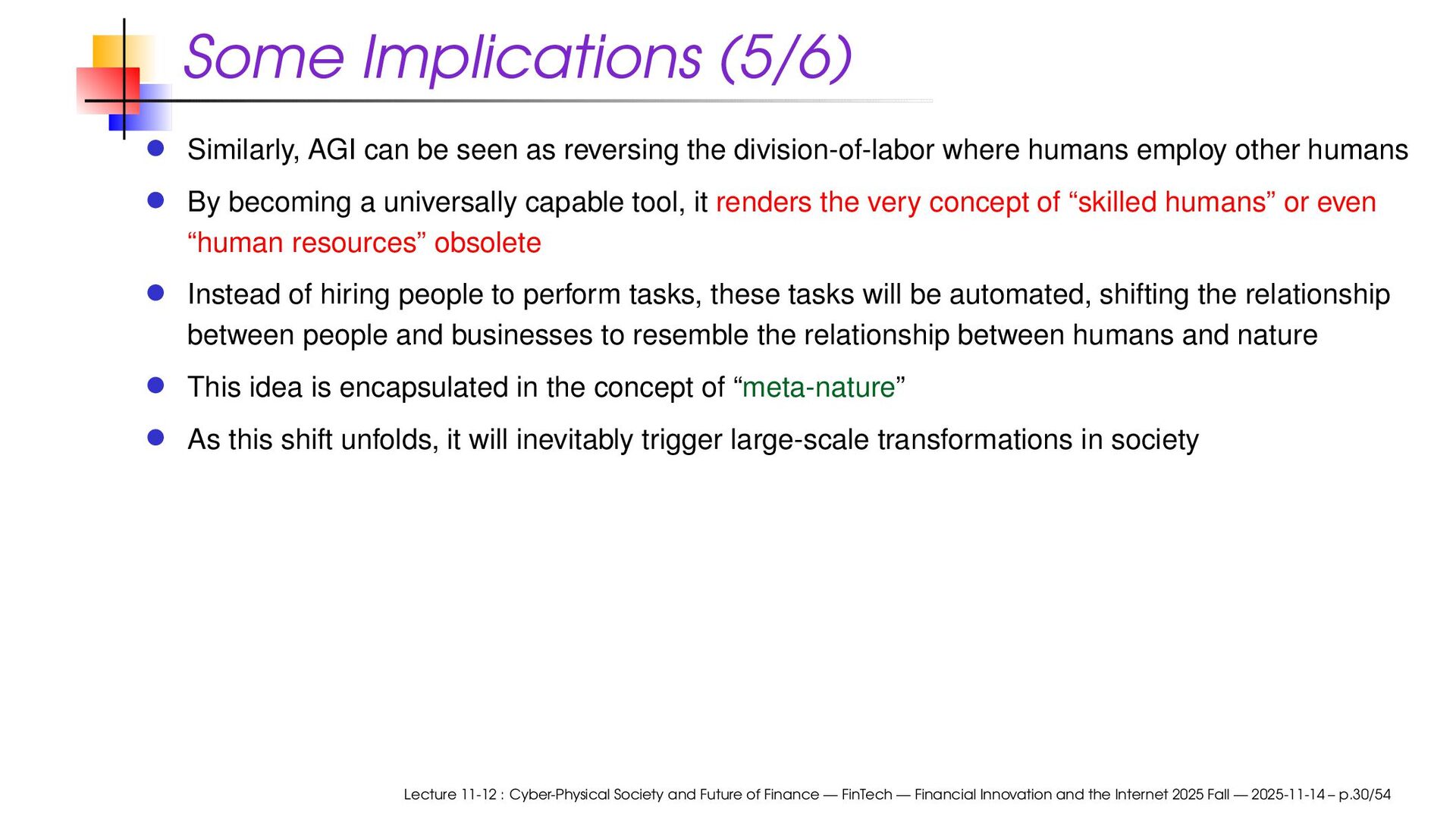 the division-of-labor where humans employ other humans By becoming a universally capable tool, it renders the very concept of “skilled humans” or even “human resources” obsolete Instead of hiring people to perform tasks, these tasks will be automated, shifting the relationship between people and businesses to resemble the relationship between humans and nature This idea is encapsulated in the concept of “meta-nature” As this shift unfolds, it will inevitably trigger large-scale transformations in society Lecture 11-12 : Cyber-Physical Society and Future of Finance — FinTech — Financial Innovation and the Internet 2025 Fall — 2025-11-14 – p.30/54