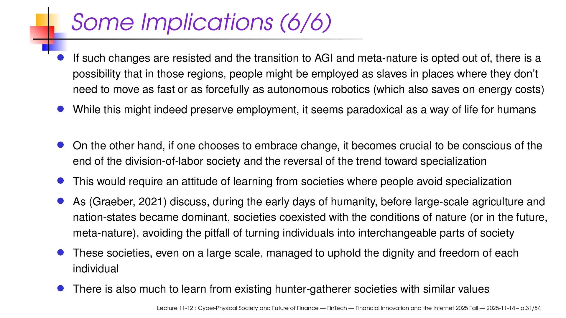 transition to AGI and meta-nature is opted out of, there is a possibility that in those regions, people might be employed as slaves in places where they don’t need to move as fast or as forcefully as autonomous robotics (which also saves on energy costs) While this might indeed preserve employment, it seems paradoxical as a way of life for humans On the other hand, if one chooses to embrace change, it becomes crucial to be conscious of the end of the division-of-labor society and the reversal of the trend toward specialization This would require an attitude of learning from societies where people avoid specialization As (Graeber, 2021) discuss, during the early days of humanity, before large-scale agriculture and nation-states became dominant, societies coexisted with the conditions of nature (or in the future, meta-nature), avoiding the pitfall of turning individuals into interchangeable parts of society These societies, even on a large scale, managed to uphold the dignity and freedom of each individual There is also much to learn from existing hunter-gatherer societies with similar values Lecture 11-12 : Cyber-Physical Society and Future of Finance — FinTech — Financial Innovation and the Internet 2025 Fall — 2025-11-14 – p.31/54