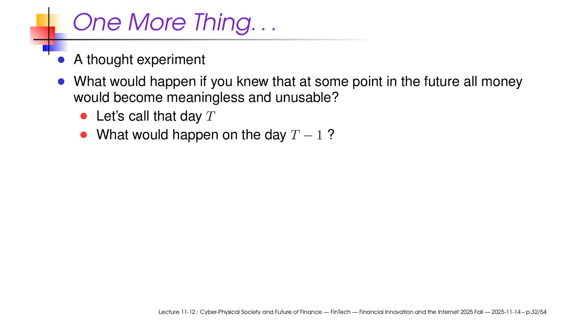 happen if you knew that at some point in the future all money would become meaningless and unusable? Let’s call that day T What would happen on the day T − 1 ? Lecture 11-12 : Cyber-Physical Society and Future of Finance — FinTech — Financial Innovation and the Internet 2025 Fall — 2025-11-14 – p.32/54