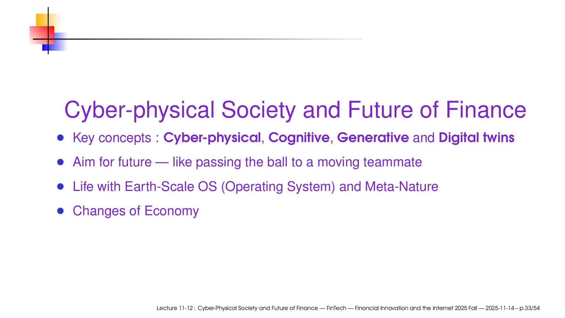 Cognitive, Generative and Digital twins Aim for future — like passing the ball to a moving teammate Life with Earth-Scale OS (Operating System) and Meta-Nature Changes of Economy Lecture 11-12 : Cyber-Physical Society and Future of Finance — FinTech — Financial Innovation and the Internet 2025 Fall — 2025-11-14 – p.33/54