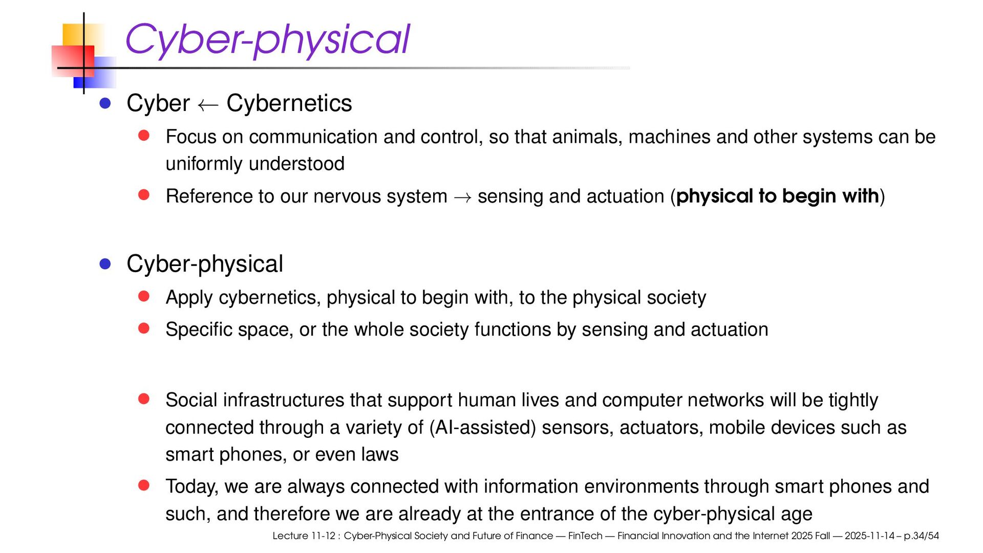 that animals, machines and other systems can be uniformly understood Reference to our nervous system → sensing and actuation (physical to begin with) Cyber-physical Apply cybernetics, physical to begin with, to the physical society Specific space, or the whole society functions by sensing and actuation Social infrastructures that support human lives and computer networks will be tightly connected through a variety of (AI-assisted) sensors, actuators, mobile devices such as smart phones, or even laws Today, we are always connected with information environments through smart phones and such, and therefore we are already at the entrance of the cyber-physical age Lecture 11-12 : Cyber-Physical Society and Future of Finance — FinTech — Financial Innovation and the Internet 2025 Fall — 2025-11-14 – p.34/54