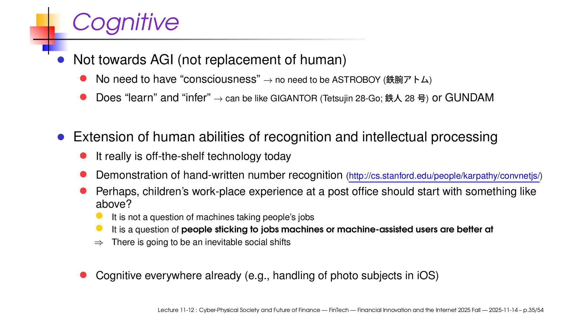 to have “consciousness” → no need to be ASTROBOY ( ) Does “learn” and “infer” → can be like GIGANTOR (Tetsujin 28-Go; 28 ) or GUNDAM Extension of human abilities of recognition and intellectual processing It really is off-the-shelf technology today Demonstration of hand-written number recognition (http://cs.stanford.edu/people/karpathy/convnetjs/) Perhaps, children’s work-place experience at a post office should start with something like above? It is not a question of machines taking people’s jobs It is a question of people sticking to jobs machines or machine-assisted users are better at ⇒ There is going to be an inevitable social shifts Cognitive everywhere already (e.g., handling of photo subjects in iOS) Lecture 11-12 : Cyber-Physical Society and Future of Finance — FinTech — Financial Innovation and the Internet 2025 Fall — 2025-11-14 – p.35/54