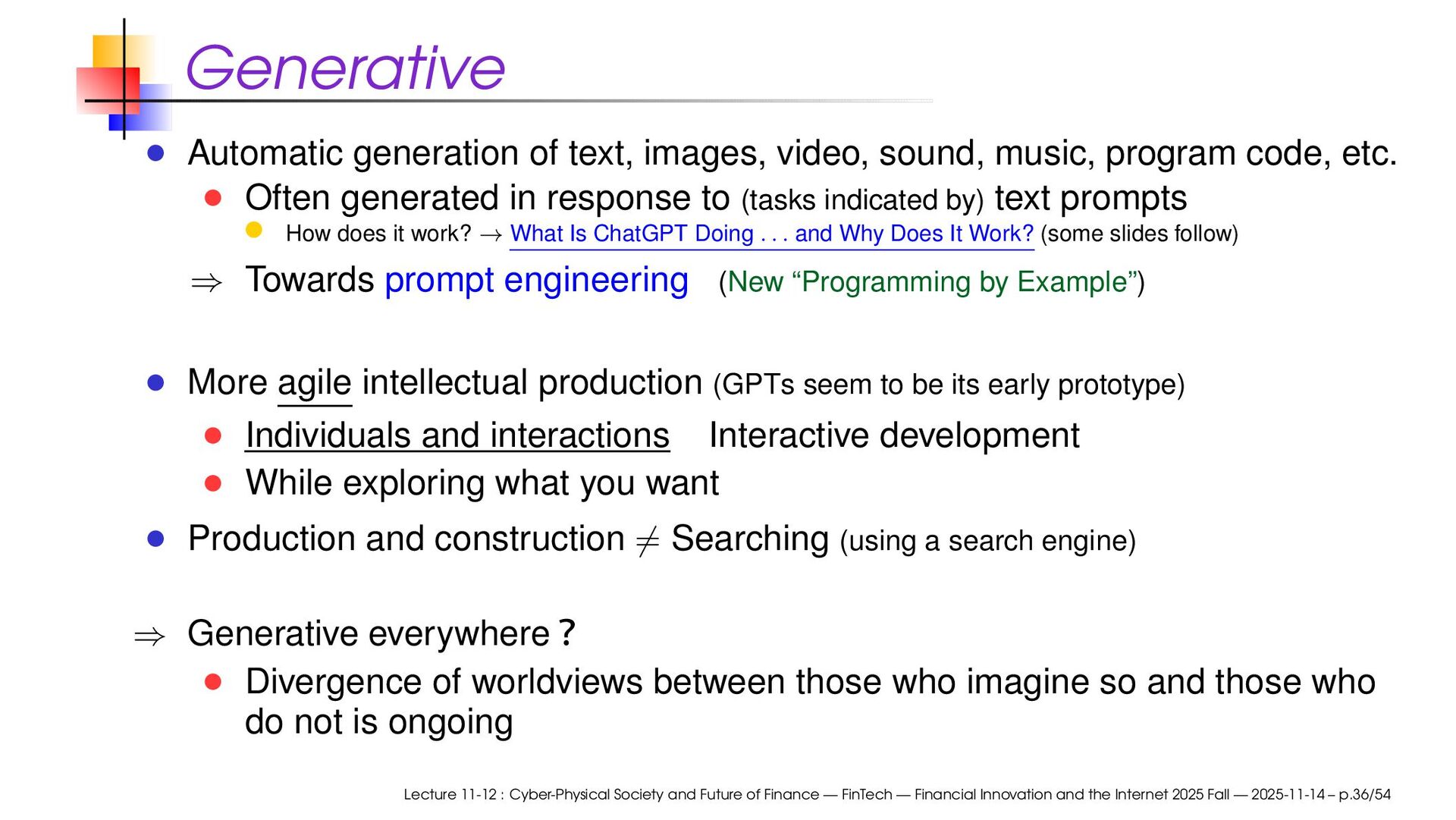 code, etc. Often generated in response to (tasks indicated by) text prompts How does it work? → What Is ChatGPT Doing . . . and Why Does It Work? (some slides follow) ⇒ Towards prompt engineering (New “Programming by Example”) More agile intellectual production (GPTs seem to be its early prototype) Individuals and interactions Interactive development While exploring what you want Production and construction = Searching (using a search engine) ⇒ Generative everywhere Divergence of worldviews between those who imagine so and those who do not is ongoing Lecture 11-12 : Cyber-Physical Society and Future of Finance — FinTech — Financial Innovation and the Internet 2025 Fall — 2025-11-14 – p.36/54