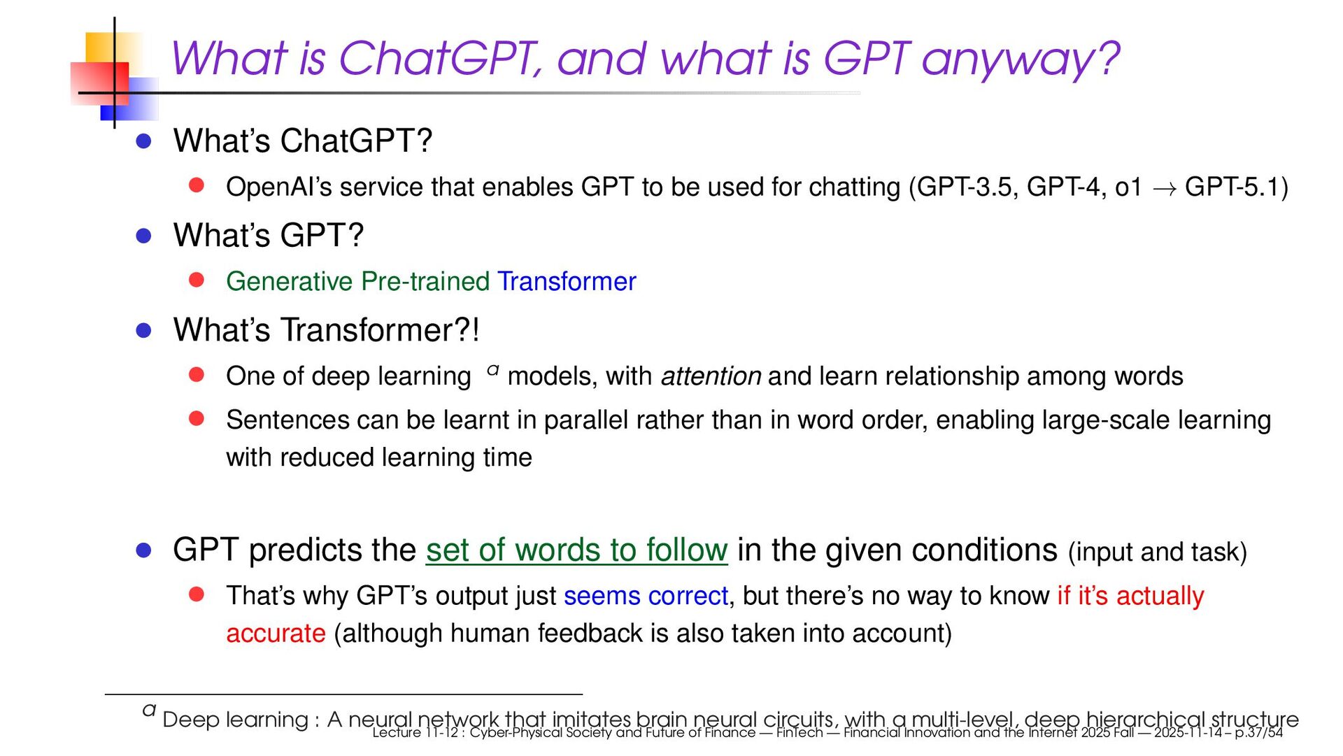 OpenAI’s service that enables GPT to be used for chatting (GPT-3.5, GPT-4, o1 → GPT-5.1) What’s GPT? Generative Pre-trained Transformer What’s Transformer?! One of deep learning a models, with attention and learn relationship among words Sentences can be learnt in parallel rather than in word order, enabling large-scale learning with reduced learning time GPT predicts the set of words to follow in the given conditions (input and task) That’s why GPT’s output just seems correct, but there’s no way to know if it’s actually accurate (although human feedback is also taken into account) a Deep learning : A neural network that imitates brain neural circuits, with a multi-level, deep hierarchical structure Lecture 11-12 : Cyber-Physical Society and Future of Finance — FinTech — Financial Innovation and the Internet 2025 Fall — 2025-11-14 – p.37/54