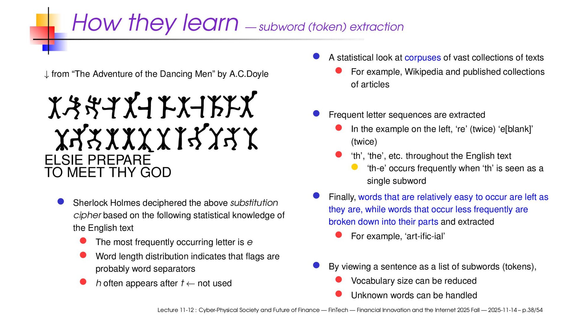 Adventure of the Dancing Men” by A.C.Doyle ELSIE PREPARE TO MEET THY GOD Sherlock Holmes deciphered the above substitution cipher based on the following statistical knowledge of the English text The most frequently occurring letter is e Word length distribution indicates that flags are probably word separators h often appears after t ← not used A statistical look at corpuses of vast collections of texts For example, Wikipedia and published collections of articles Frequent letter sequences are extracted In the example on the left, ‘re’ (twice) ‘e[blank]’ (twice) ‘th’, ‘the’, etc. throughout the English text ‘th-e’ occurs frequently when ‘th’ is seen as a single subword Finally, words that are relatively easy to occur are left as they are, while words that occur less frequently are broken down into their parts and extracted For example, ‘art-ific-ial’ By viewing a sentence as a list of subwords (tokens), Vocabulary size can be reduced Unknown words can be handled Lecture 11-12 : Cyber-Physical Society and Future of Finance — FinTech — Financial Innovation and the Internet 2025 Fall — 2025-11-14 – p.38/54