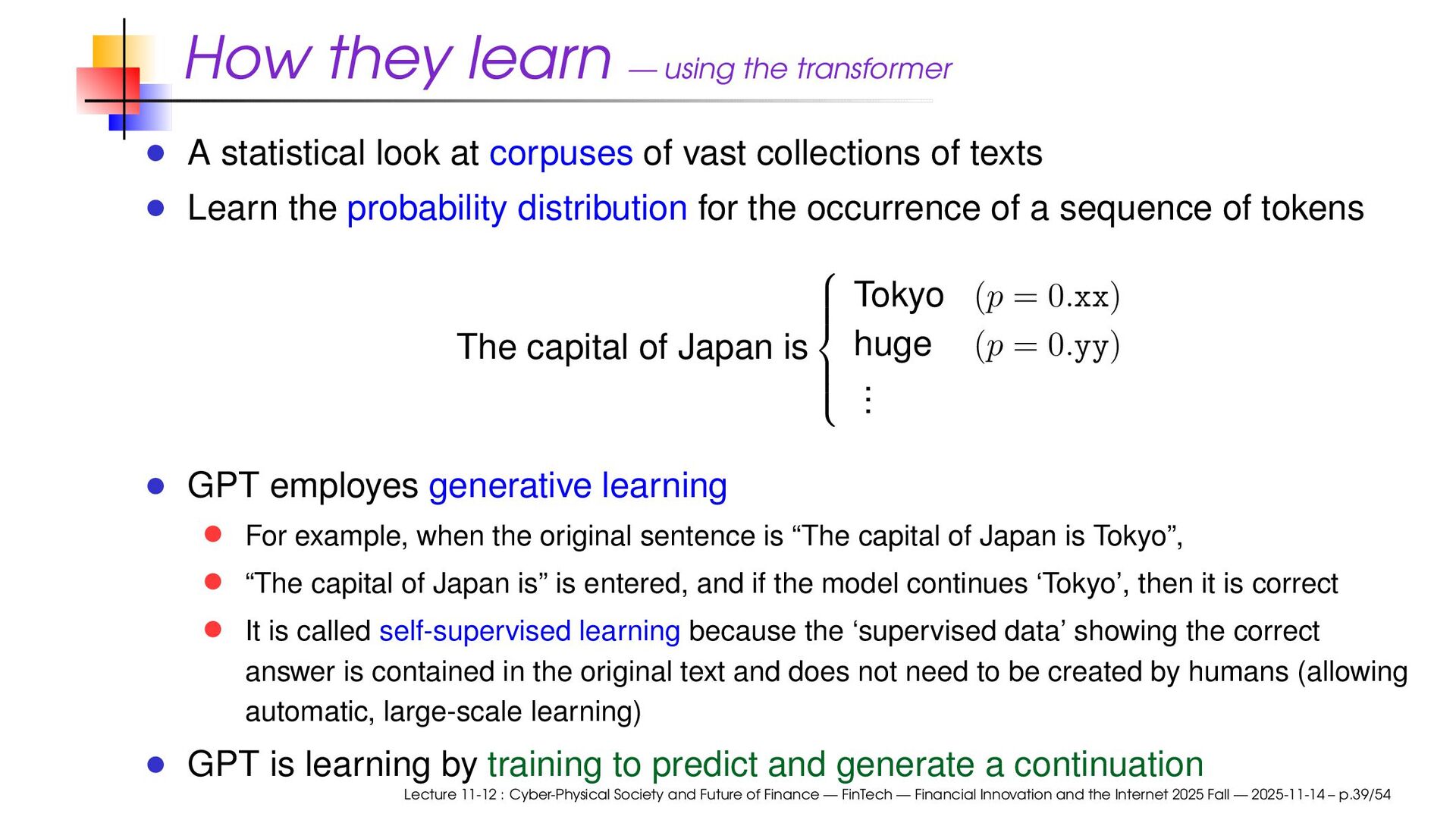 at corpuses of vast collections of texts Learn the probability distribution for the occurrence of a sequence of tokens The capital of Japan is          Tokyo (p = 0.xx) huge (p = 0.yy) . . . GPT employes generative learning For example, when the original sentence is “The capital of Japan is Tokyo”, “The capital of Japan is” is entered, and if the model continues ‘Tokyo’, then it is correct It is called self-supervised learning because the ‘supervised data’ showing the correct answer is contained in the original text and does not need to be created by humans (allowing automatic, large-scale learning) GPT is learning by training to predict and generate a continuation Lecture 11-12 : Cyber-Physical Society and Future of Finance — FinTech — Financial Innovation and the Internet 2025 Fall — 2025-11-14 – p.39/54