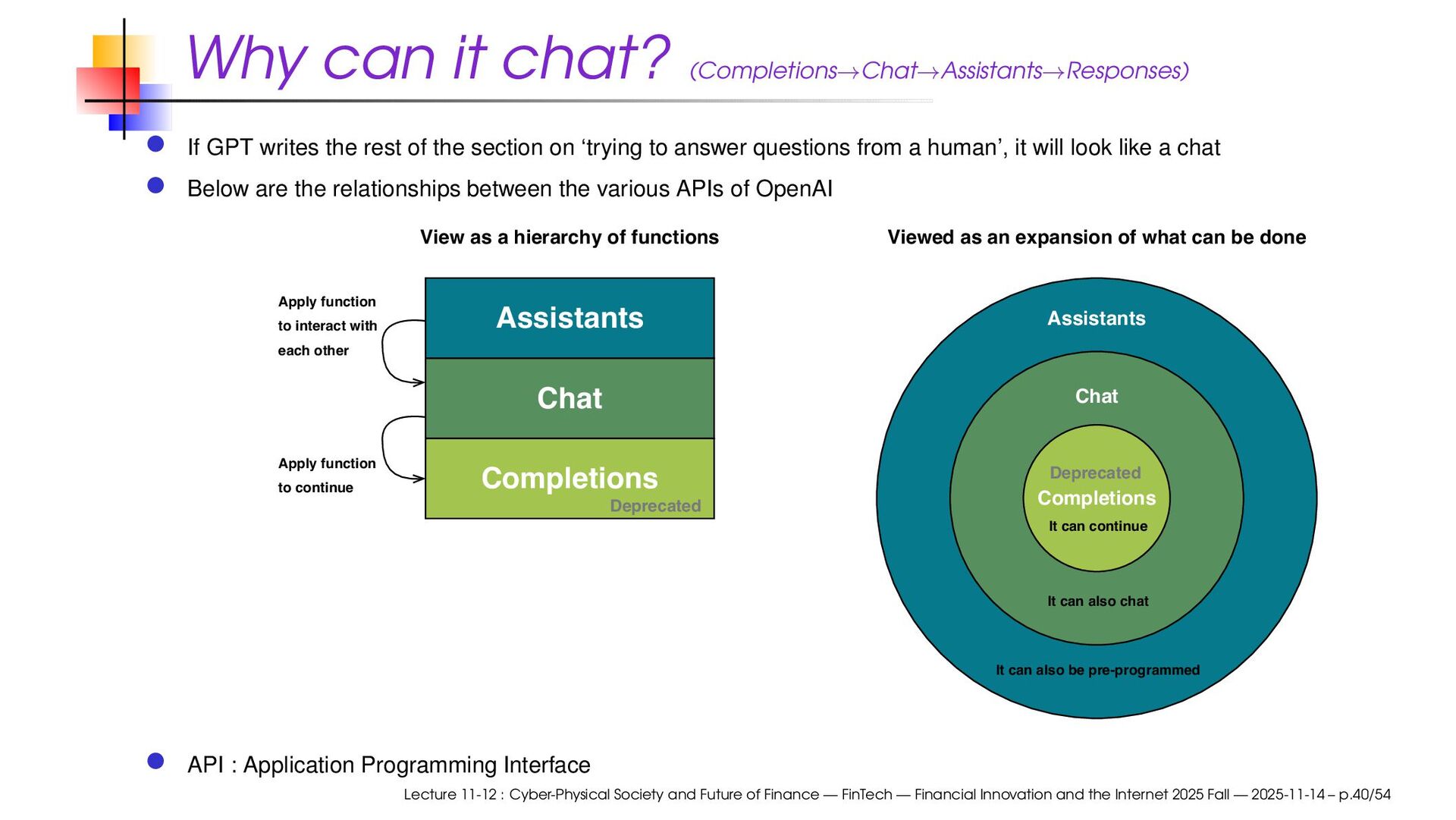 of the section on ‘trying to answer questions from a human’, it will look like a chat Below are the relationships between the various APIs of OpenAI Assistants Chat Completions View as a hierarchy of functions Viewed as an expansion of what can be done Completions Chat Assistants It can continue It can also chat Apply function to continue Apply function to interact with each other Deprecated Deprecated It can also be pre-programmed API : Application Programming Interface Lecture 11-12 : Cyber-Physical Society and Future of Finance — FinTech — Financial Innovation and the Internet 2025 Fall — 2025-11-14 – p.40/54