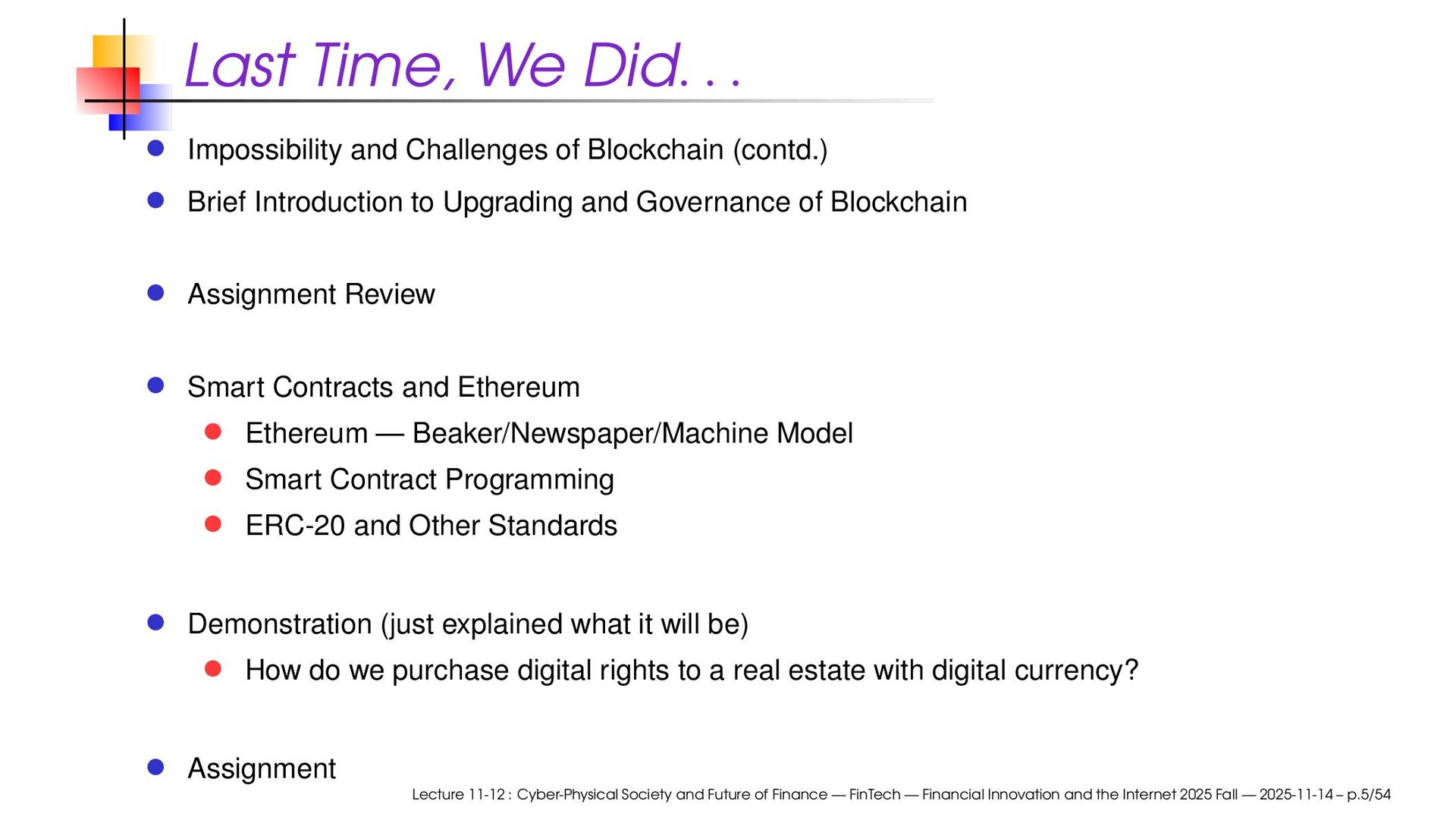 Blockchain (contd.) Brief Introduction to Upgrading and Governance of Blockchain Assignment Review Smart Contracts and Ethereum Ethereum — Beaker/Newspaper/Machine Model Smart Contract Programming ERC-20 and Other Standards Demonstration (just explained what it will be) How do we purchase digital rights to a real estate with digital currency? Assignment Lecture 11-12 : Cyber-Physical Society and Future of Finance — FinTech — Financial Innovation and the Internet 2025 Fall — 2025-11-14 – p.5/54